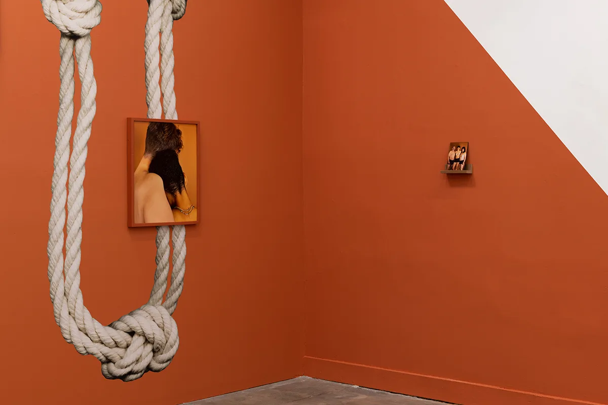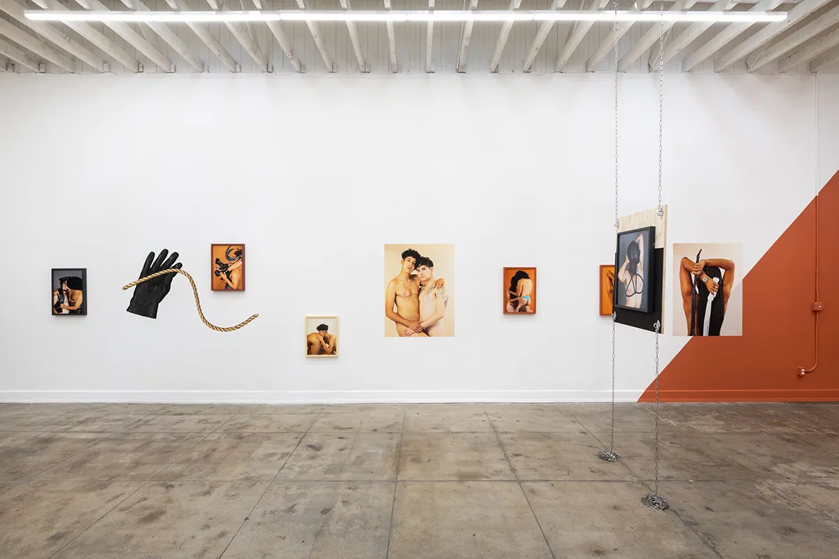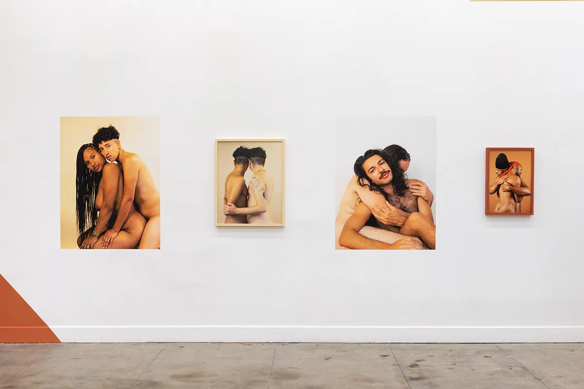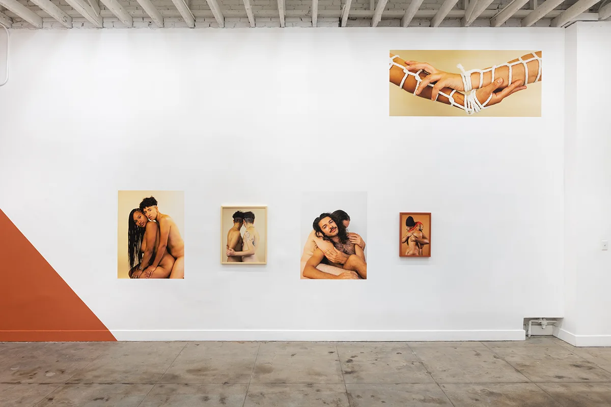 Ariza photographs their kinship communities against an array of honey-colored, tangerine, terra cotta, or blush backdrops—a palette that emphasizes skin tones and expands skin color into the space beyond the figures. Crops of fleshy curves, hairy creases, and supple bends of unadorned and unclothed bodies assemble like an architecture of bodily contact. Ariza is acutely aware of the precariousness of representation—how it can be and is often used to restrict or control. Ariza creates support for each subject’s self-determination via anonymity through concealed faces, aliases in titles, or most notably by adhering images that feature direct eye contact with the camera-cum-audience directly to the gallery walls—restricting these artwork’s salability and their potential reexhibition.