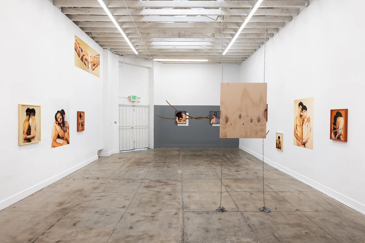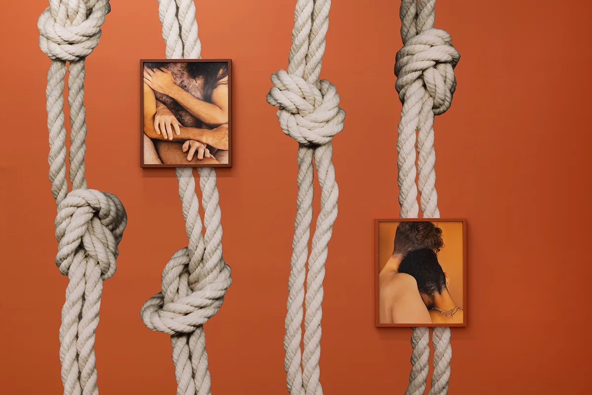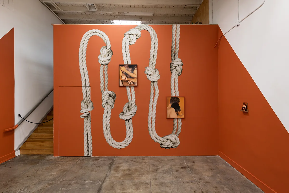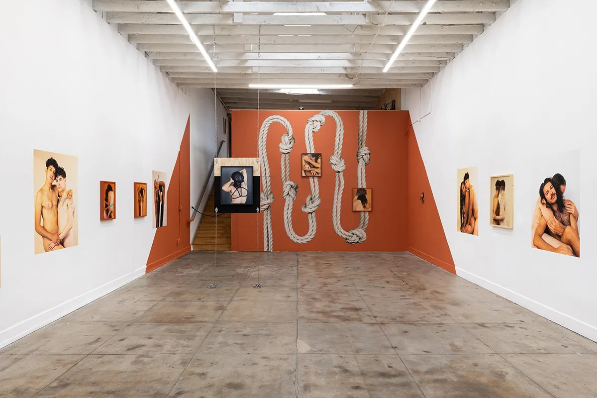 Ariza photographs their kinship communities against an array of honey-colored, tangerine, terra cotta, or blush backdrops—a palette that emphasizes skin tones and expands skin color into the space beyond the figures. Crops of fleshy curves, hairy creases, and supple bends of unadorned and unclothed bodies assemble like an architecture of bodily contact. Ariza is acutely aware of the precariousness of representation—how it can be and is often used to restrict or control. Ariza creates support for each subject’s self-determination via anonymity through concealed faces, aliases in titles, or most notably by adhering images that feature direct eye contact with the camera-cum-audience directly to the gallery walls—restricting these artwork’s salability and their potential reexhibition.