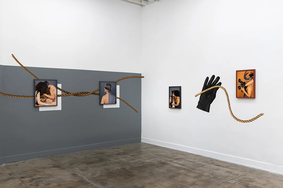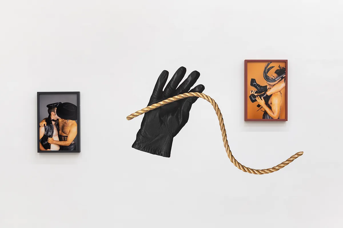 Those not nude sport select gear—collars, corsets, hats, thongs, and platform shoes. Latex tape, rope, fetish masks, and floggers all create abstract or indirect pathways to touch—traces of a recent touch, a dissociative way to touch oneself, or the glorious anticipation of a touch to come. Since the lockdown, the meaning and methods of touch have irrevocably shifted and Ariza reifies this moment within the discourse of queerness, trans identity, and BDSM culture. “We couldn’t have imagined a time [pre-pandemic] where touch, or lack of touch, would become an act of solidarity,” says Ariza. The present time is a gift—a chance “to reimagine how we want to live, with whom, and how we can and should take care of each other.”