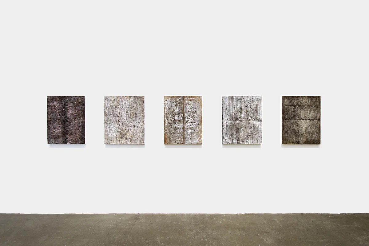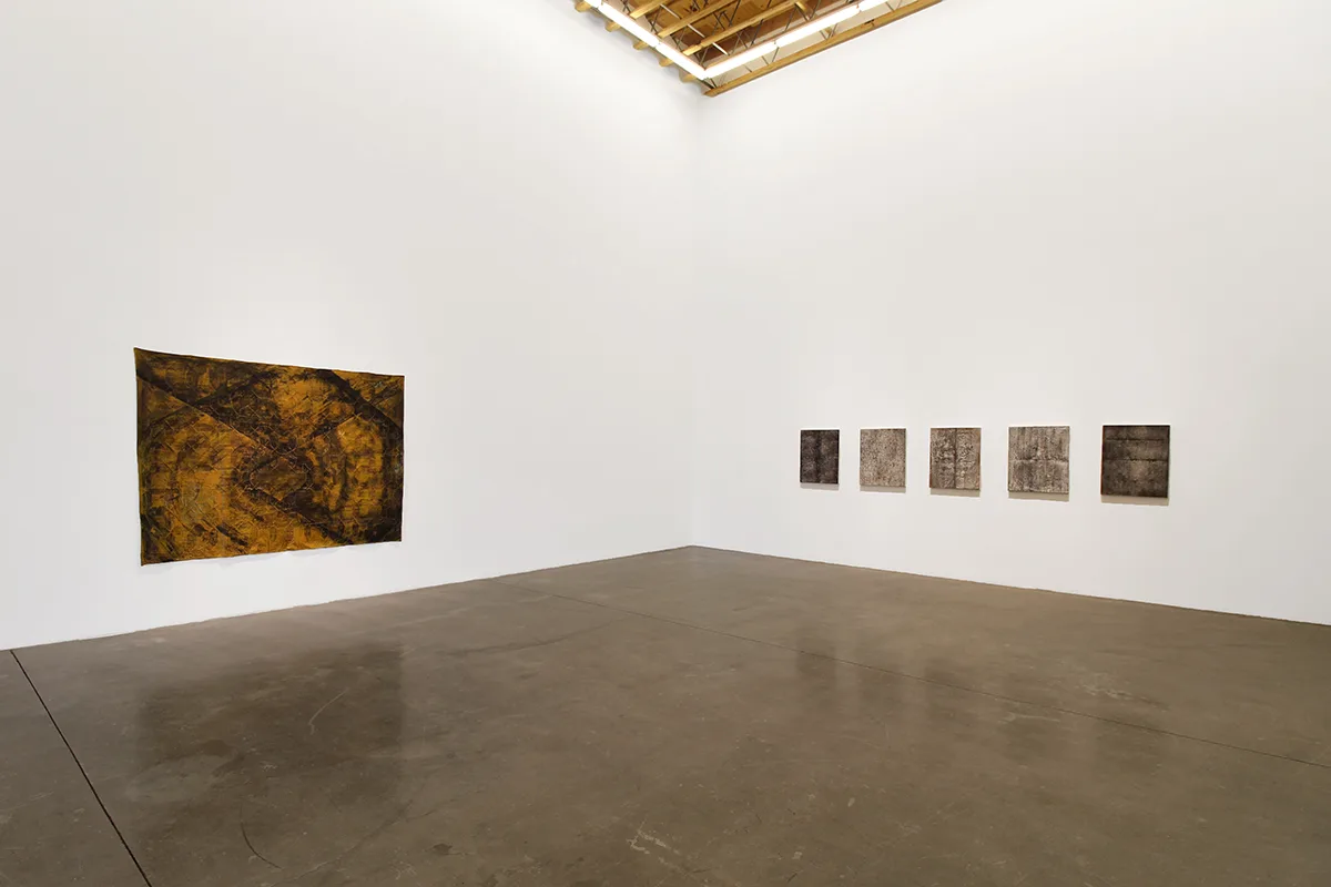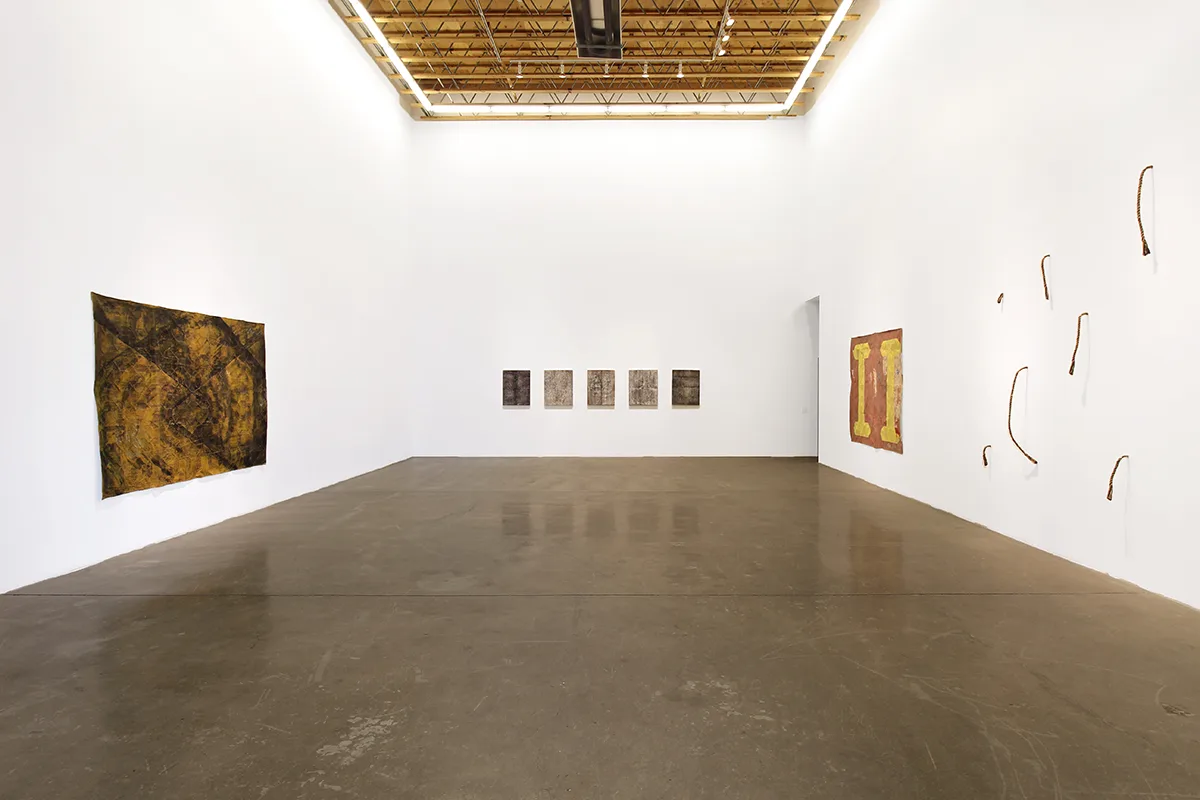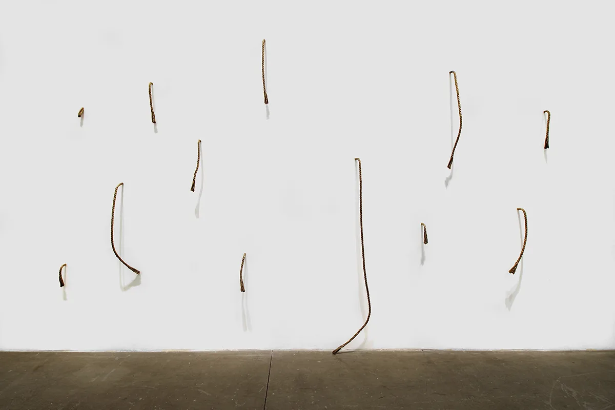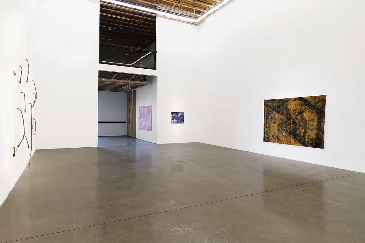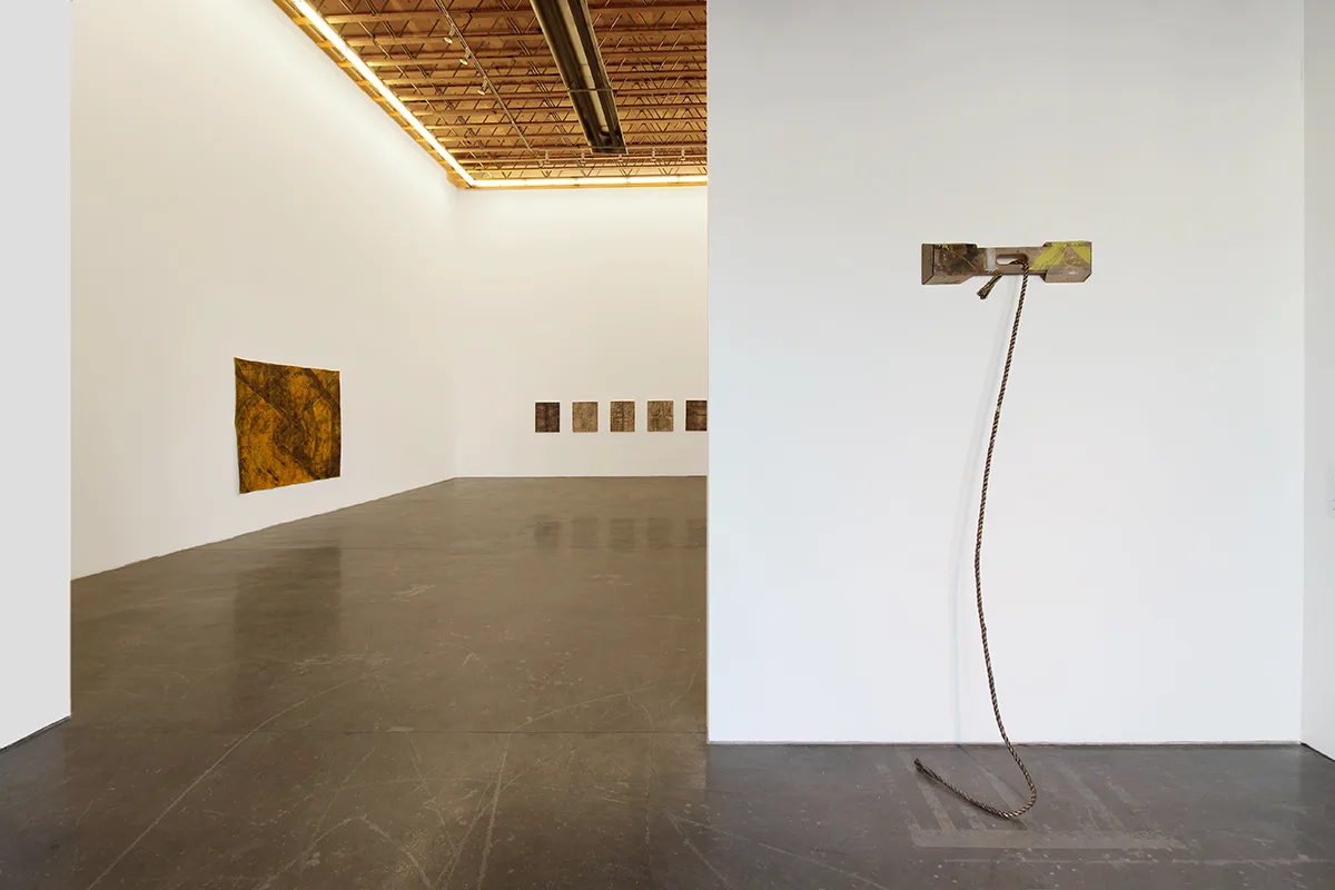 Rendering her paintings through collage, paint, plaster and sanding, Minai reveals the delicate edges where her memories transmute into layered surfaces, reminiscent of bodily architectures that are simultaneously sites of nostalgia, erasure and imagination. Parducci’s bronze cast ropes, some protruding from the walls, others slung over mounted worn wooden sawhorse handles– familiar objects cast in unfamiliar arrangements–linger as if to suggest an accident, an incomplete task, a morbid joke that the viewer isn’t quite in on. By casting the desert floor, or working with ash from an extinguished fire, Johnson creates earth-toned palates that tell stories of remnants–the works gesture towards the impossibility of creating an experiential index of the Anthropocene, of capturing an ephemeral lived moment within the limitlessness of nature.