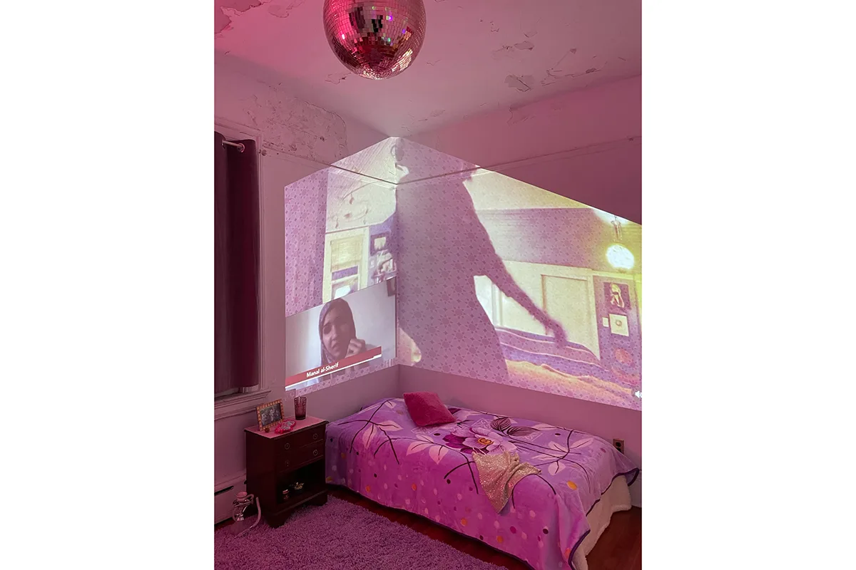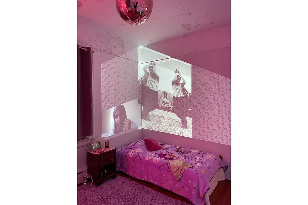 'For Your Eyes Only' (2021) is the latest iteration of an ongoing series of bedroom installations using domestic space to explore third culture identity, the systemic oppression of women, and feminist activisms in the Global South and its diaspora. Diaz’s everygirl’s room setting is a pink teenager’s bedroom featuring gently pulsating lights, a rose-colored disco ball that shines upon the contents of the space: a bed, a vanity mirror and a glaring pink neon light in the shape of an “evil eye.” On the floor are objects one would expect to see at a protest spilling out of a backpack: protective eye goggles, a megaphone, a small first aid kit, a water bottle, sanitizer and an ACLU pocket ‘know your rights’ booklet. Projected on the wall is a video of women and non-binary individuals dancing freely in their private spaces and archival footage of political speeches and manifestations, and an original minimalist house track.