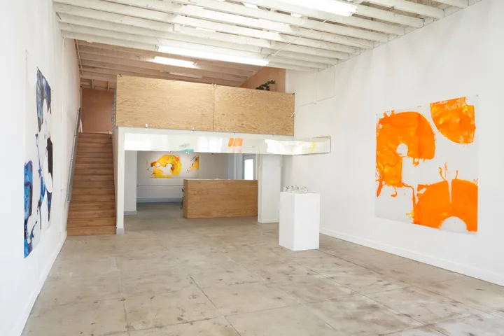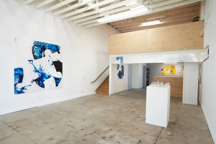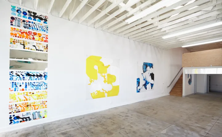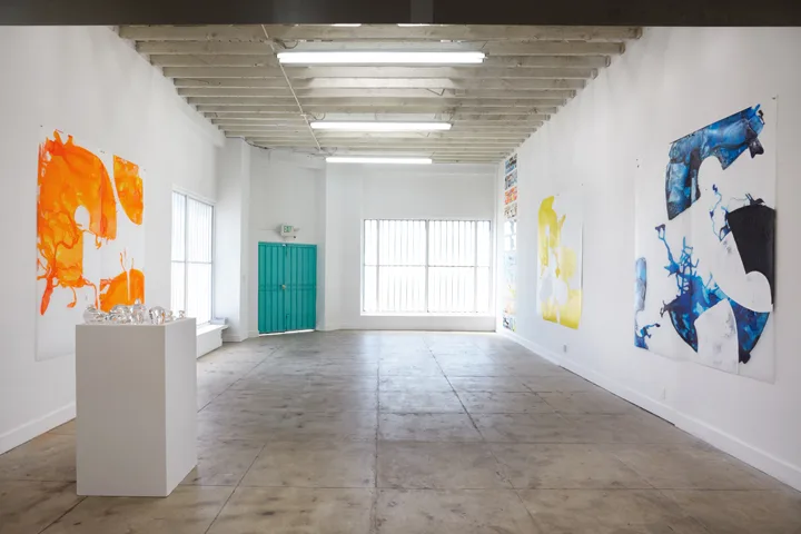 Grand in scale, physically restless and unapologetically bold, Solomon’s new body of work SkyFuel employs the artist’s signature use of novel materials (mylar, soda ash, and this time “skyfuel”) as well as an unconventional color palette. Solomon’s paintings appear to be highly controlled, the shapes meticulously rendered, but they also take on the appearance of the accidental, as though Solomon simply allowed the paint to succumb to gravity in the tradition of gestural abstraction. Although static, the dynamic materiality of the paintings catches and reflects light and shadow. Vivid color and thick, opaque paint offers the sense of weight, only to be juxtaposed with transparent, bare mylar that feels quite immaterial.