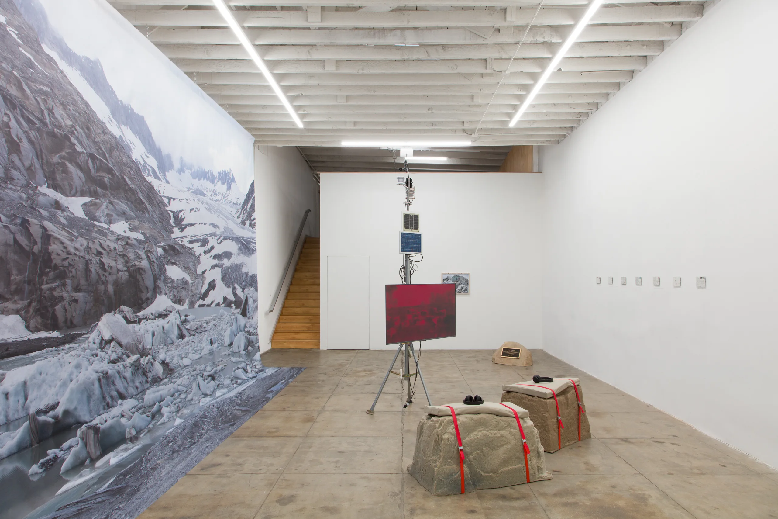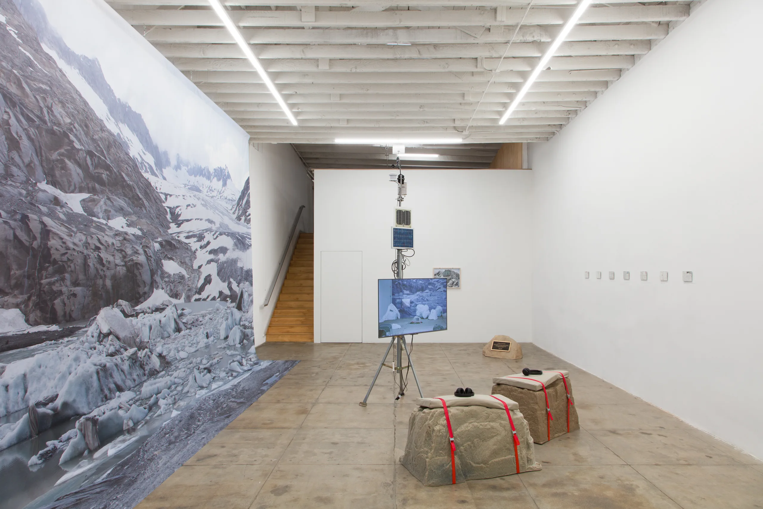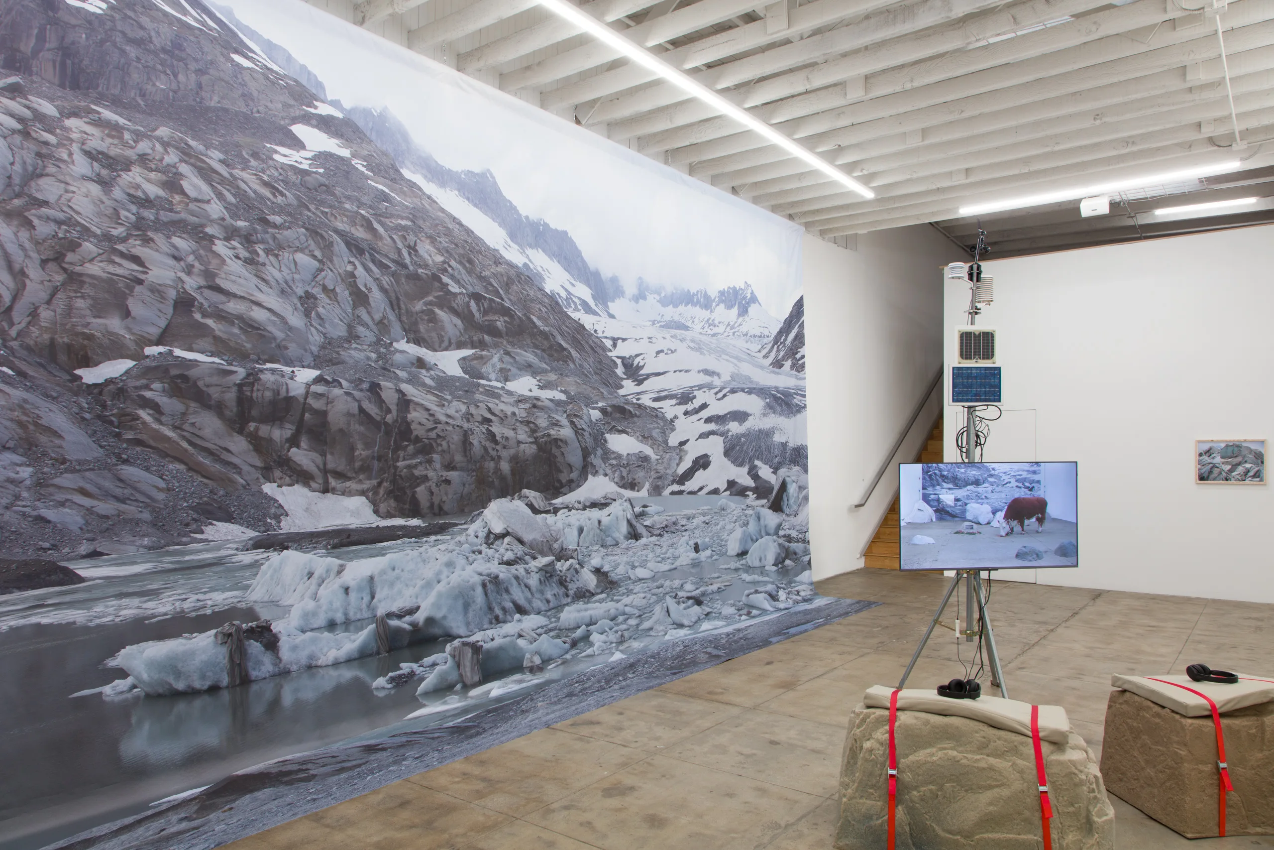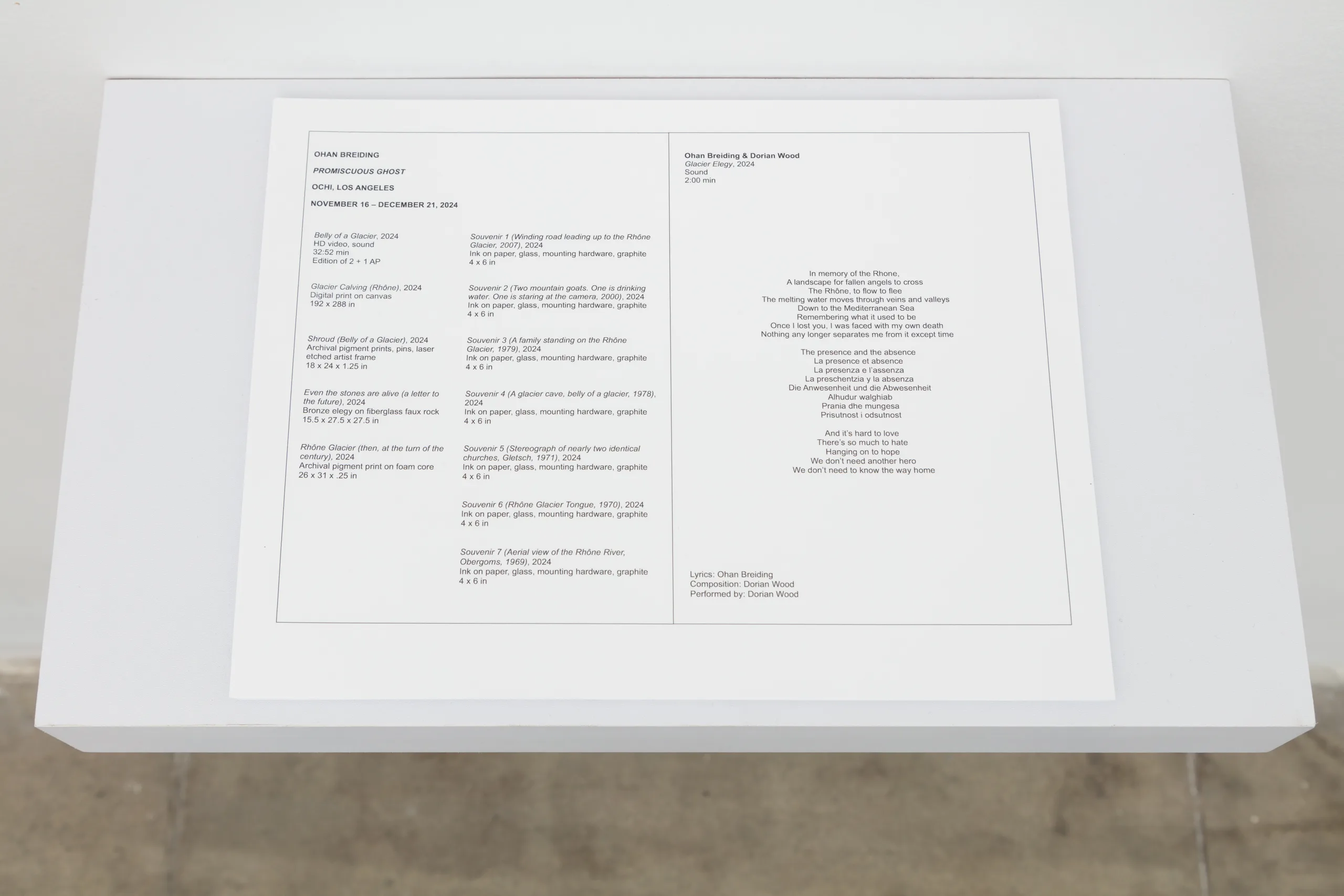 Promiscuous Ghost reflects on ice as memory and as a site to explore new forms of collective resistance. Ice manifests queer and trans materiality as both glacial and physical bodies bear witness to social and environmental transformation. Reflecting on these themes through the varied scales of monuments and souvenirs that emerge via photography, sculpture, and song, the exhibition considers the conditions and possibility of a future against the current odds. Corresponding language across the bodies of animals and those of glaciers—“glacier tongue,” “glacier snout,” “belly of a glacier,” and “calving”—fosters attendance to what the ice has to say and ultimately invites a closer listening to the landscapes that sustain us.