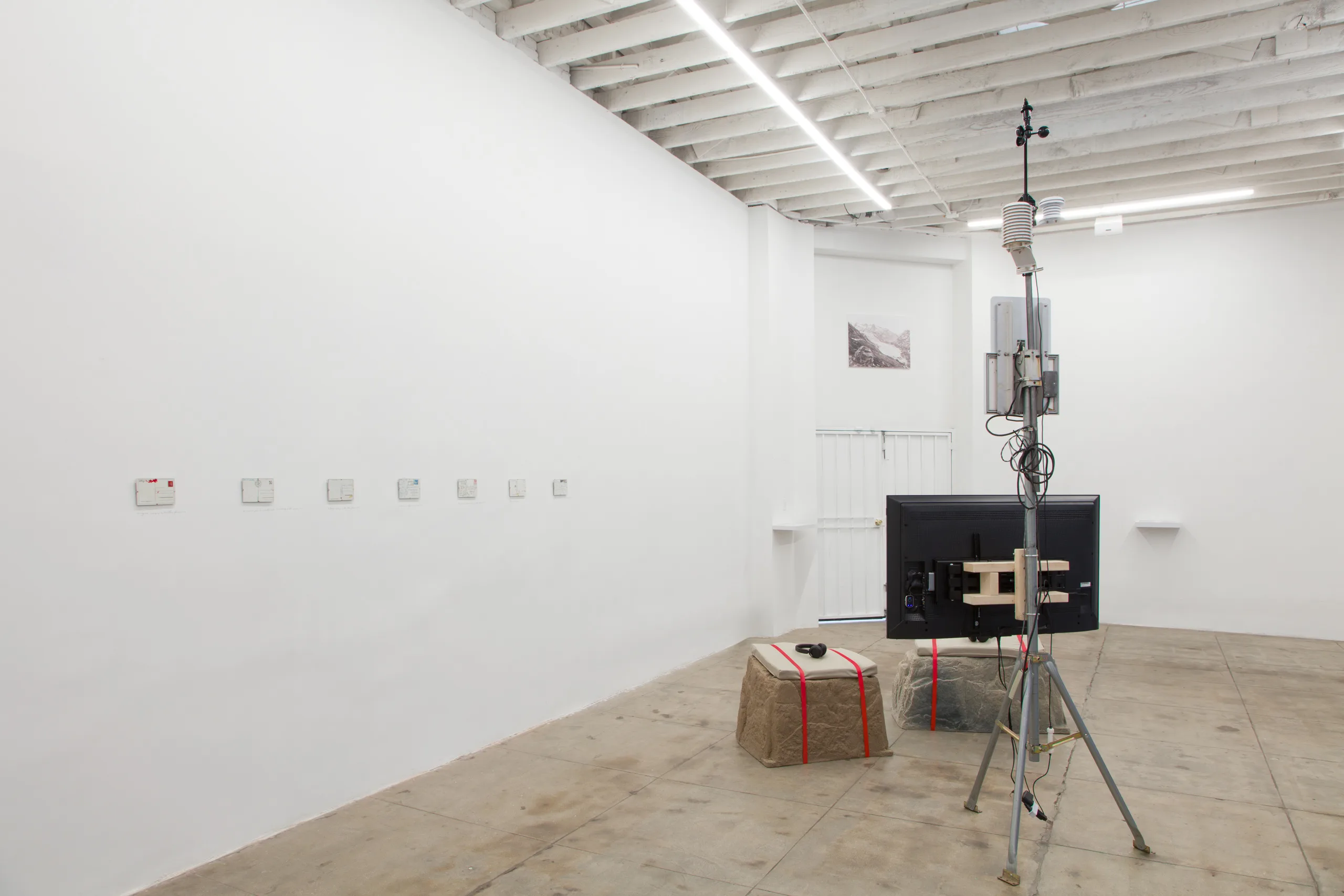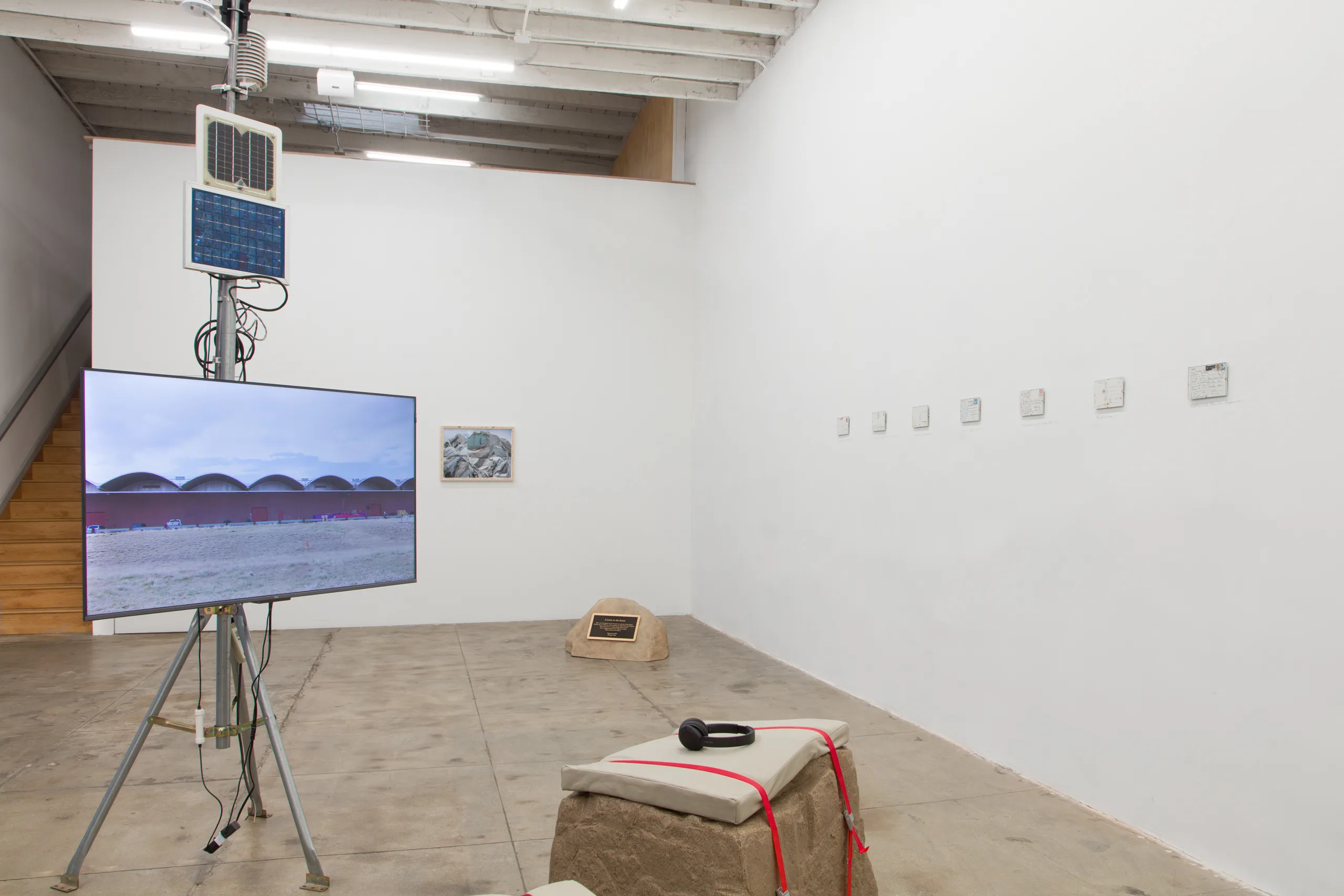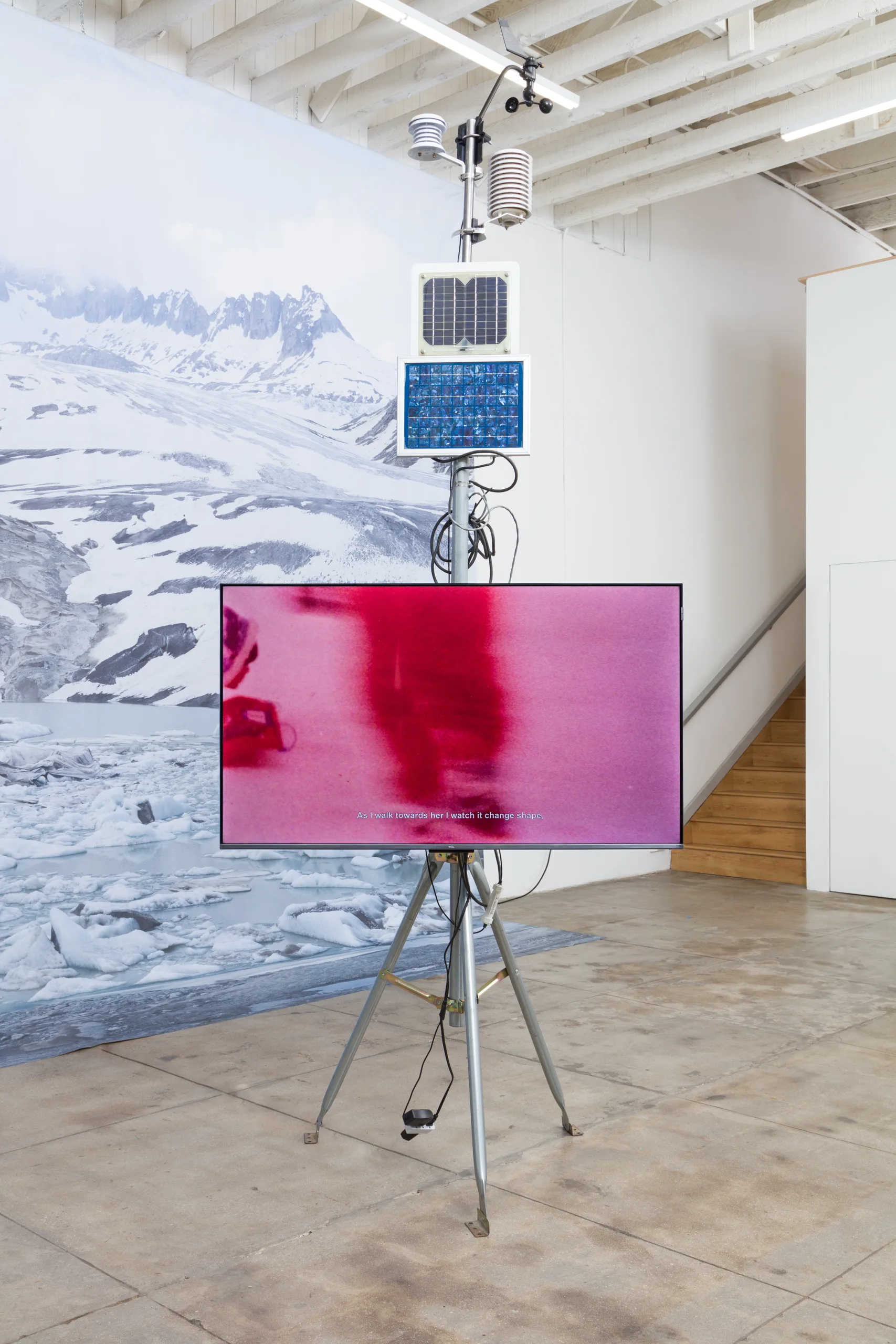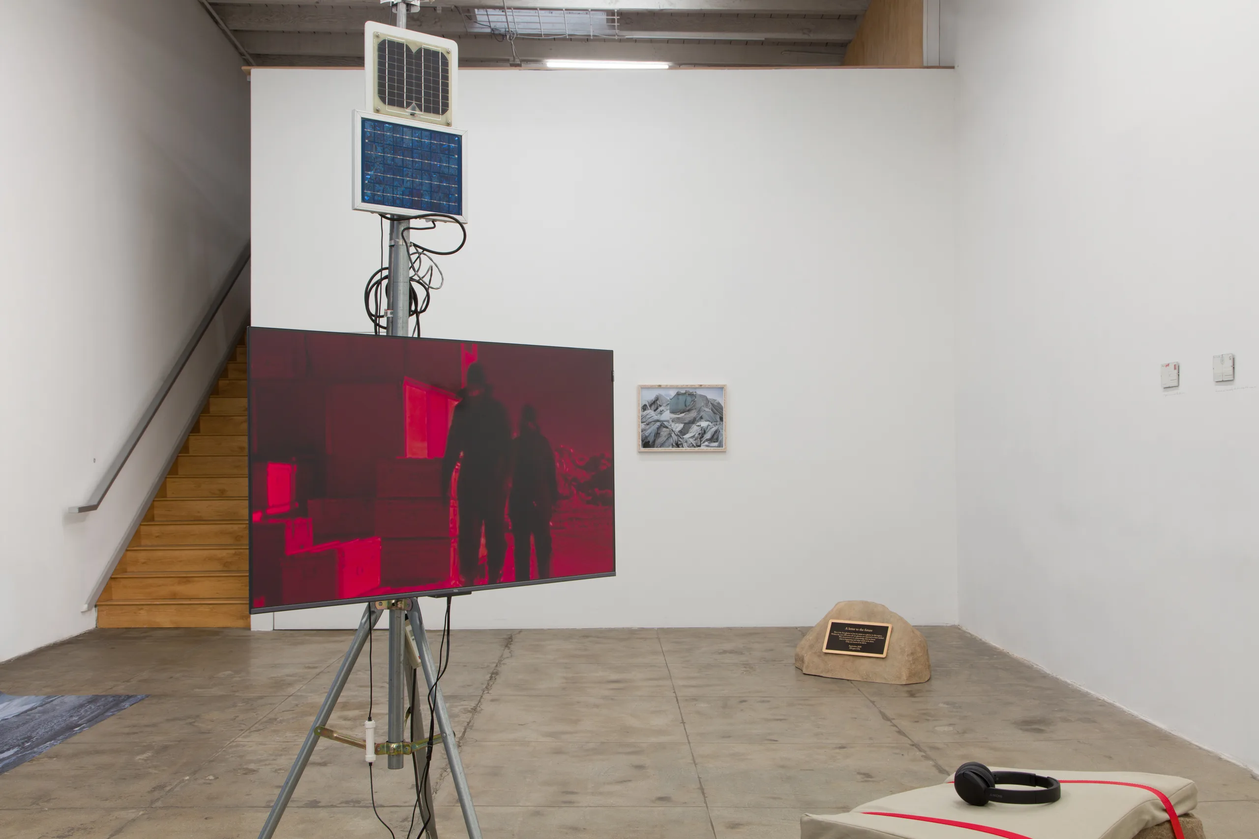Ohan Breiding works in photography, video, drawing, and collaboration to represent ritualized practices of collective grief that perform the intimate entanglement of human and environmental well-being. Promiscuous Ghost presents a speculative glacier funeral set in the artist’s accompanying film, Belly of a Glacier. The film is projected from a found weather station, chosen for its technological, symbolic, and site-specific qualities, and the film is shown alongside a song made in collaboration with Dorian Wood, Glacier Elegy. Glacier funerary practices began in 2019, when Iceland constructed the first memorial to mark the death of its Okjökull Glacier. Glacier funerals have since been held around the world to mark the melting of glacial bodies.