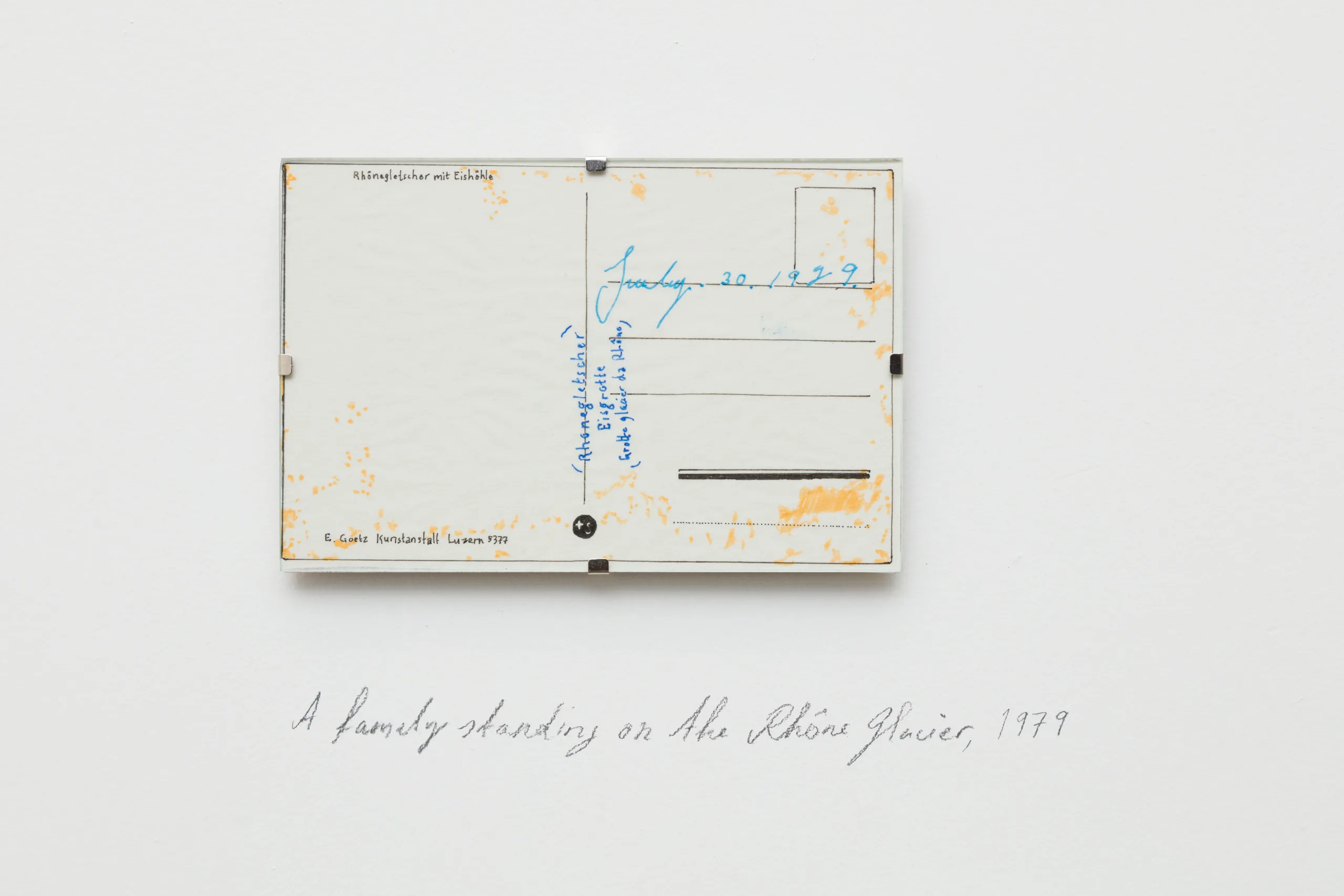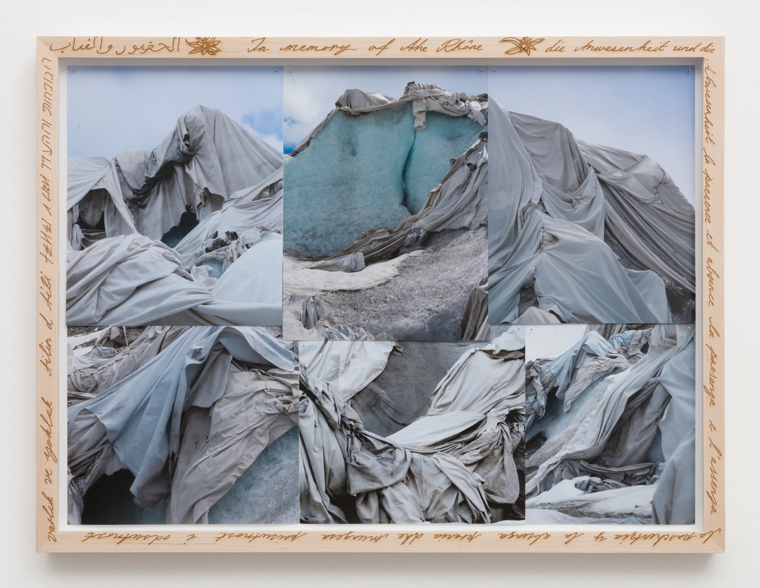 Amplifying the current state of climate emergency, Breiding returned to their childhood home in rural Switzerland via their family photo archive and the now ghostscape of the Rhône Glacier where villagers from nearby Obergoms drape thermal blankets over the glacier to insulate it from rising temperatures. Recalling the German etymology of the word “home,” Breiding references the origins “Heimat” and “Gast,” meaning “home” or “haunting,” and “guest” or “ghost,” respectively, while examining their own roots as a visitor to the remains of the glacier. According to glaciologists, the Rhône Glacier is expected to have fully disappeared by 2050. Breiding documented the glacier through photographic and video imagery as well as sound recordings while considering concepts of fever, bodily fragility, and glacier calving—which is paralleled in the film by the birth of a cow.