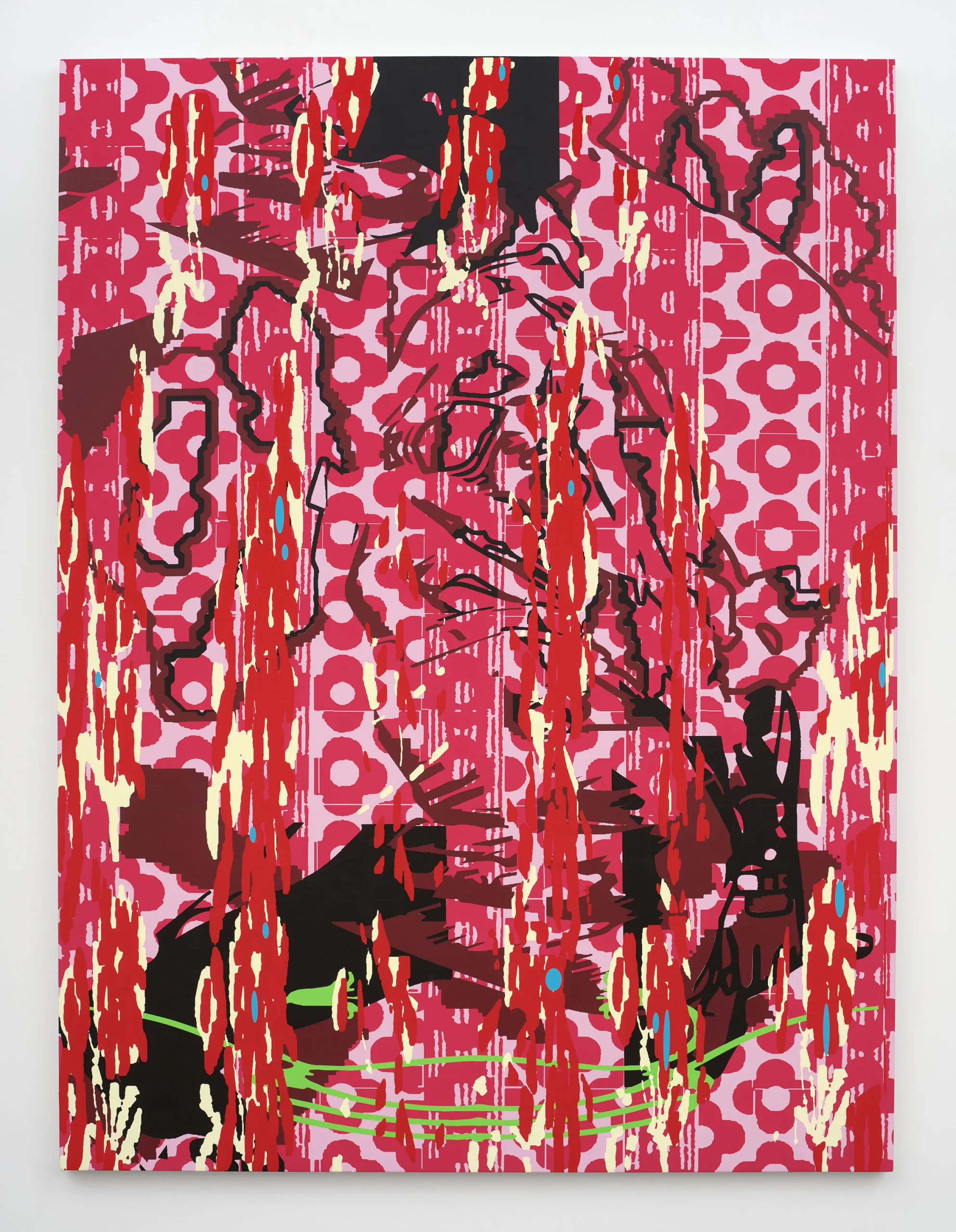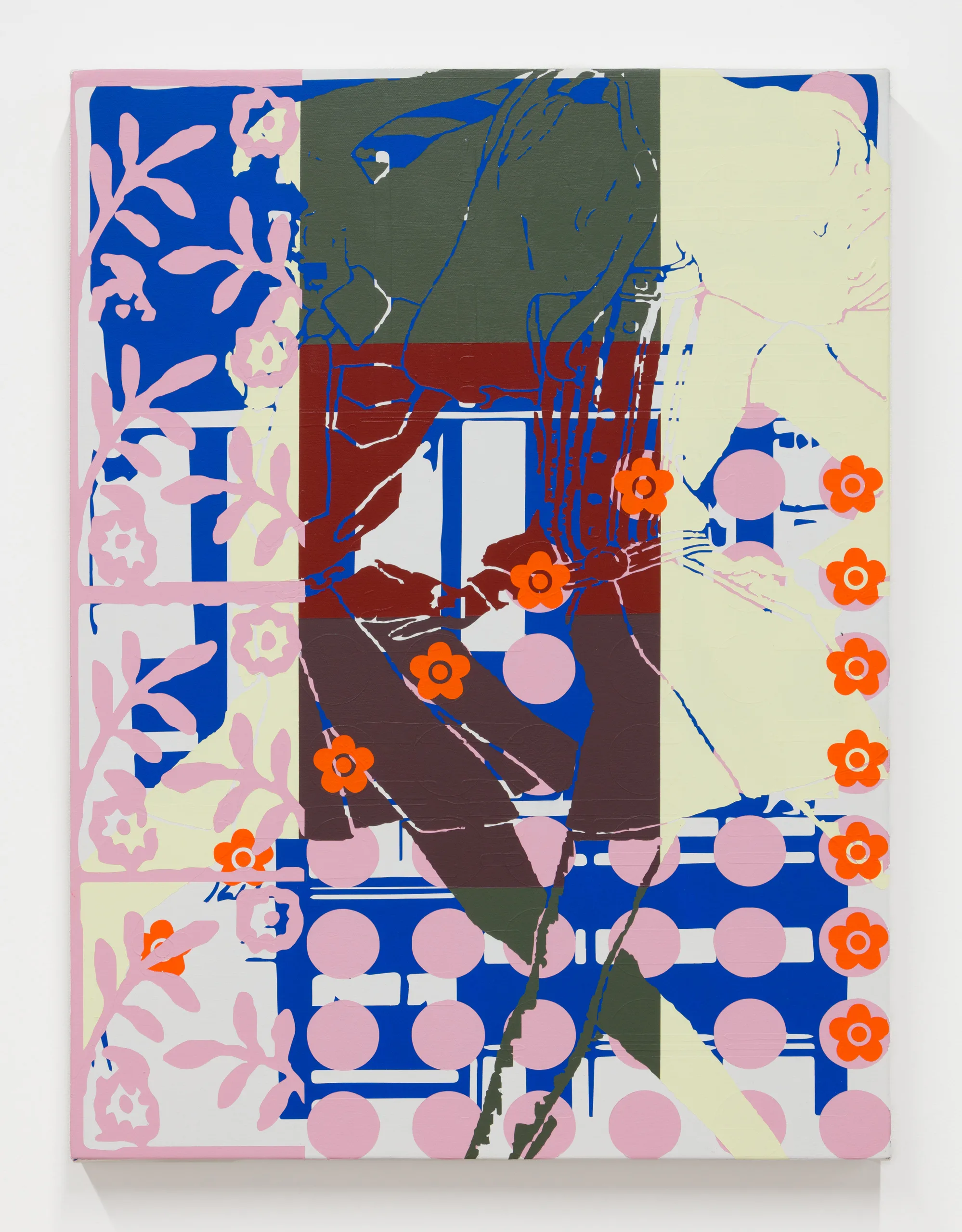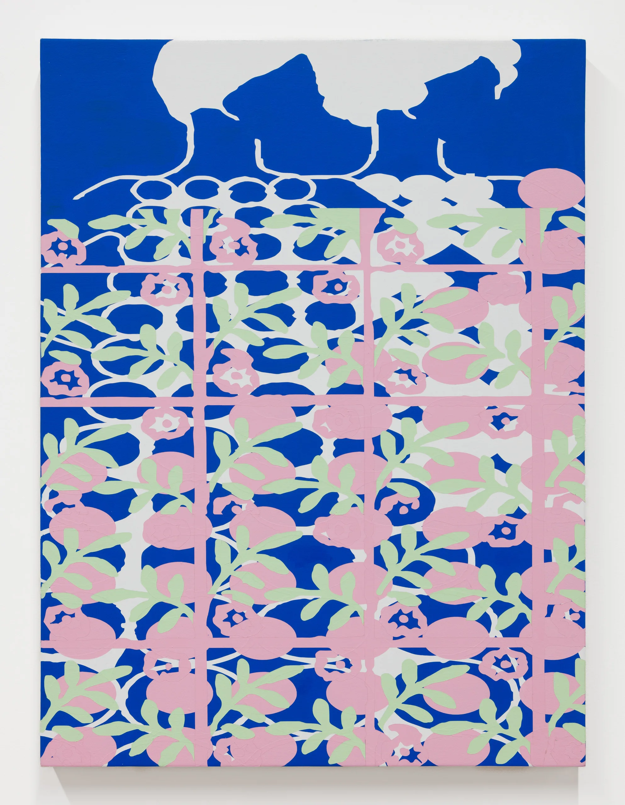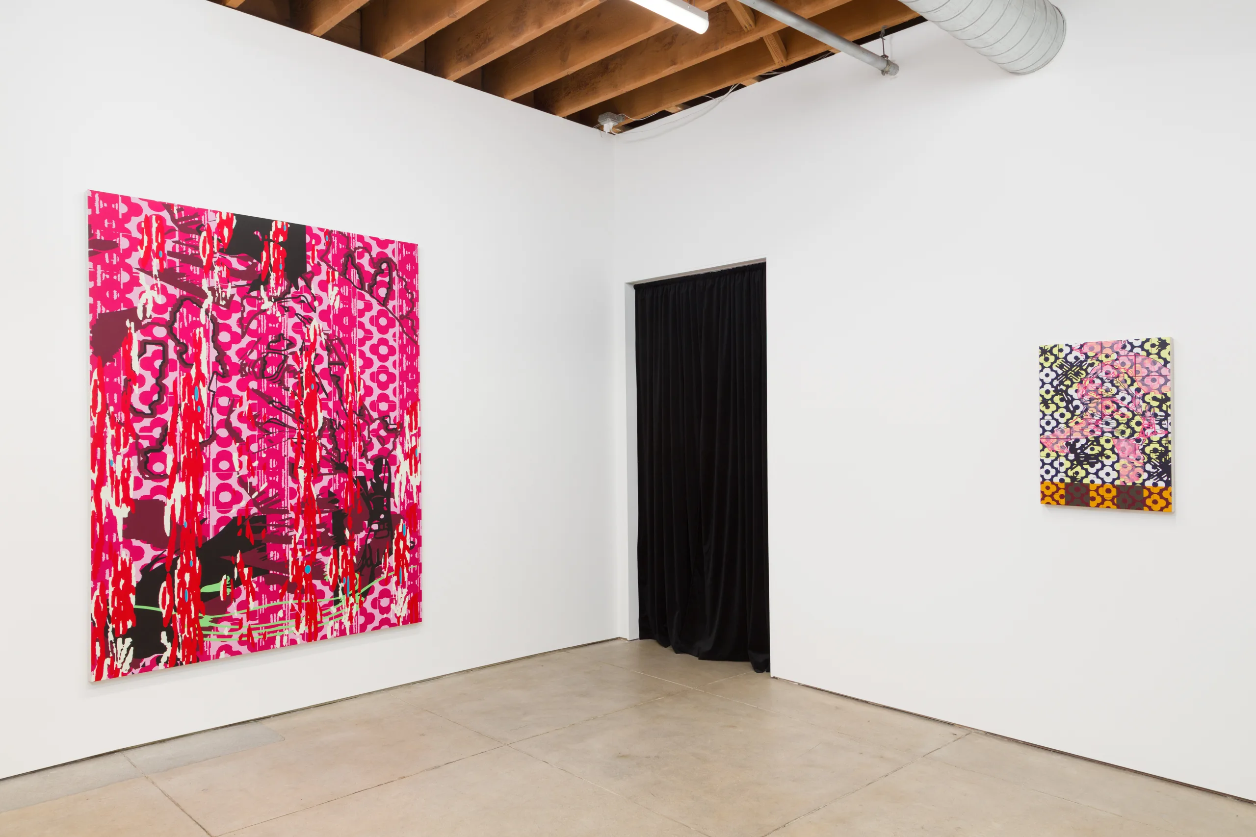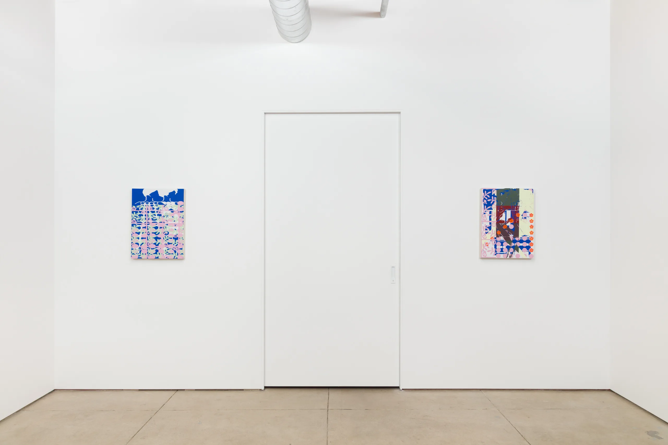 OCHI presents Opening, a solo presentation by Los Angeles-based artist Alex Heilbron. Heilbron’s paintings explore the tension between the logical order of systems and the fray of their collapse. Drawing upon design histories and the visual flotsam of our collective cultural cache, Heilbron manipulates found images at a granular level. The resulting digitally mediated forms are translated into vinyl stencils and layered onto canvas, where poured, rolled, and brushed paint create epidermal surfaces that are both meticulously handwrought and governed by technological constraint.