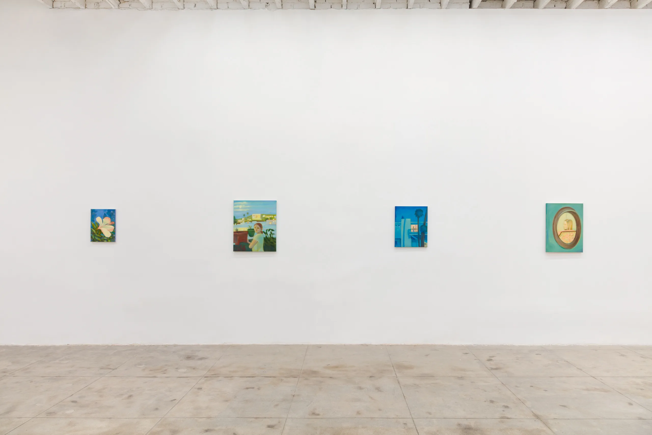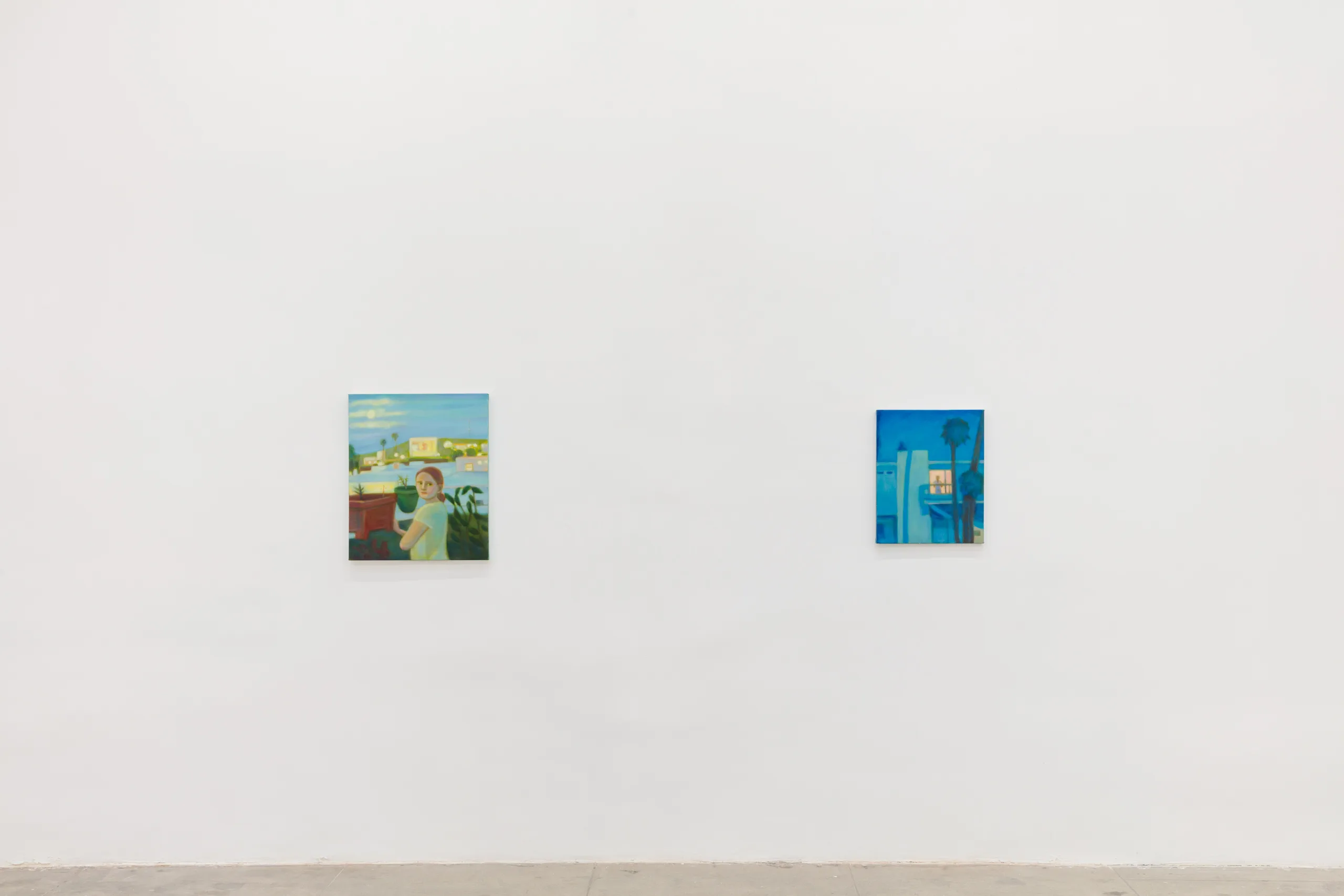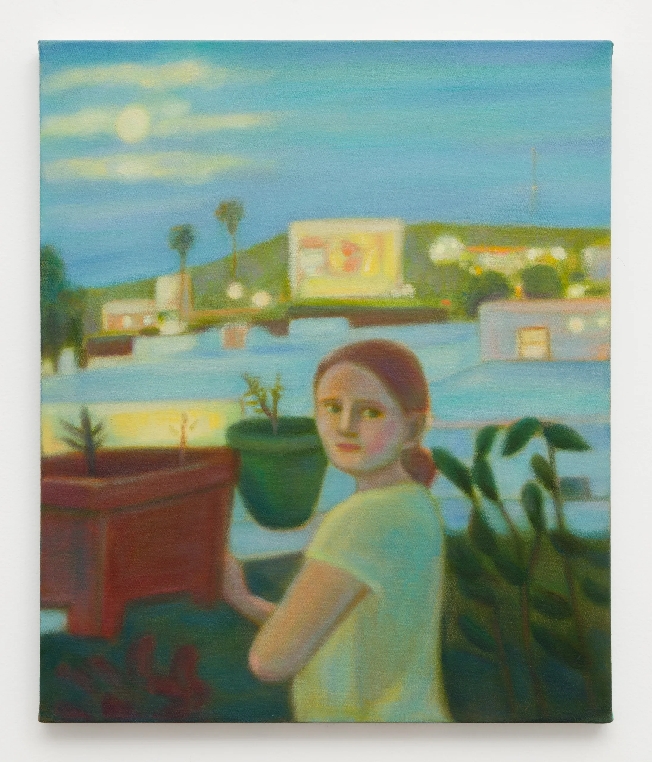 Often depicting her daughters, Turner-Uribe joins the longstanding art historical tradition of artists painting their children, families, and close companions. Providing an intimate glimpse into the artist’s personal life with tenderness and connection, the practice also reflects broader social context, capturing everyday life. Turner-Uribe refers to the domestic familiarity of artists such as Gwen John and her observational paintings of women holding books; Mary Cassatt’s tender depictions of women’s inner lives and subtle play of light; and Paula Modorsohn-Becker’s nude self-portraits, among others. She paints a radiant sunset and includes the numerous trash cans on the street; she features palms and a luminous apartment interior alongside a dilapidated tarp catching the wind; and she depicts her daughter on their balcony amongst the moon rise over the billboards and buildings that obscure the distant hills. In casting a glowing evening light on the otherwise mundane, Turner-Uribe honors the polarities and realities of life in Los Angeles. In the blue hour of dusk, the city and its flaws all feel a bit more magical.