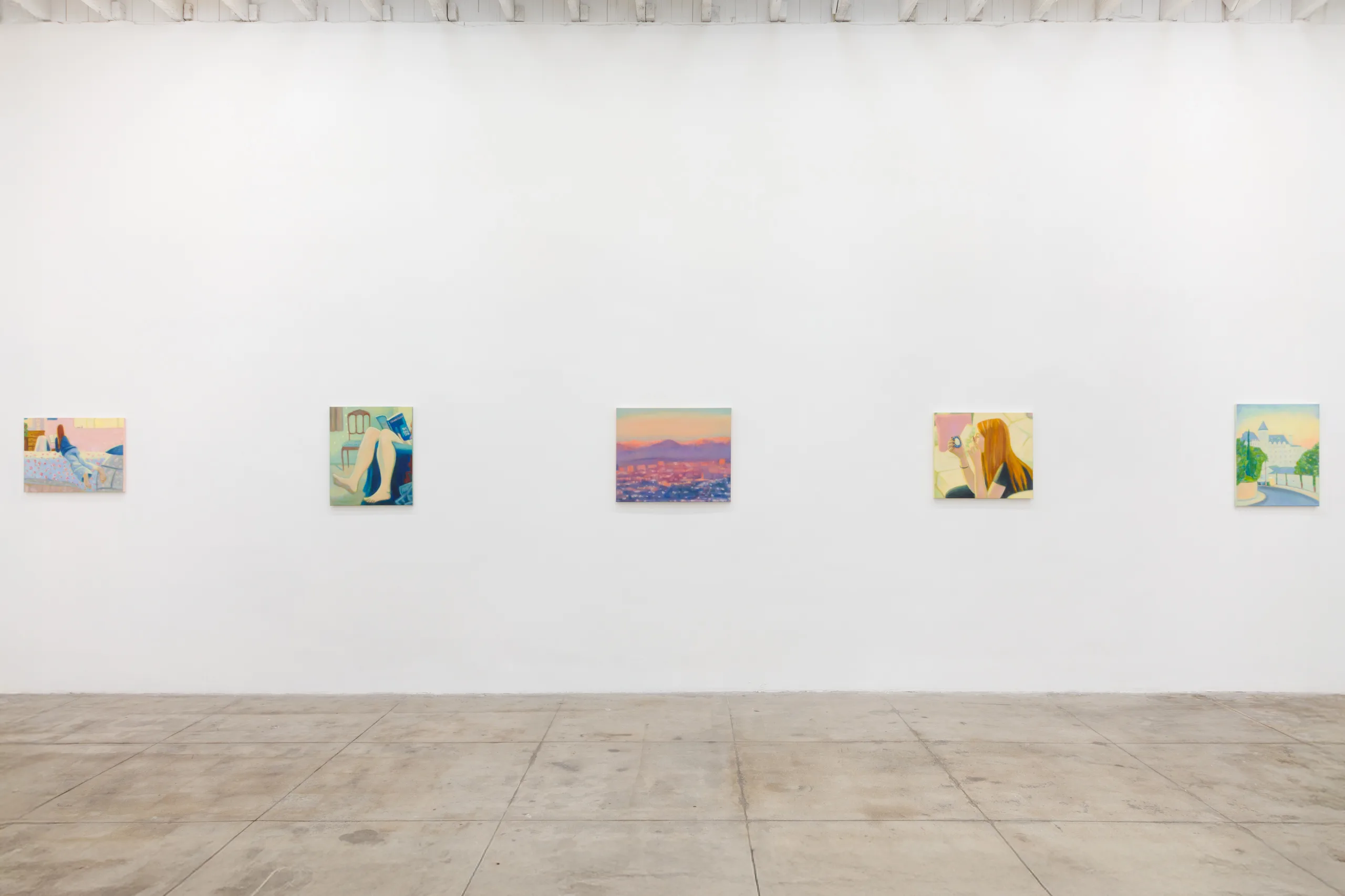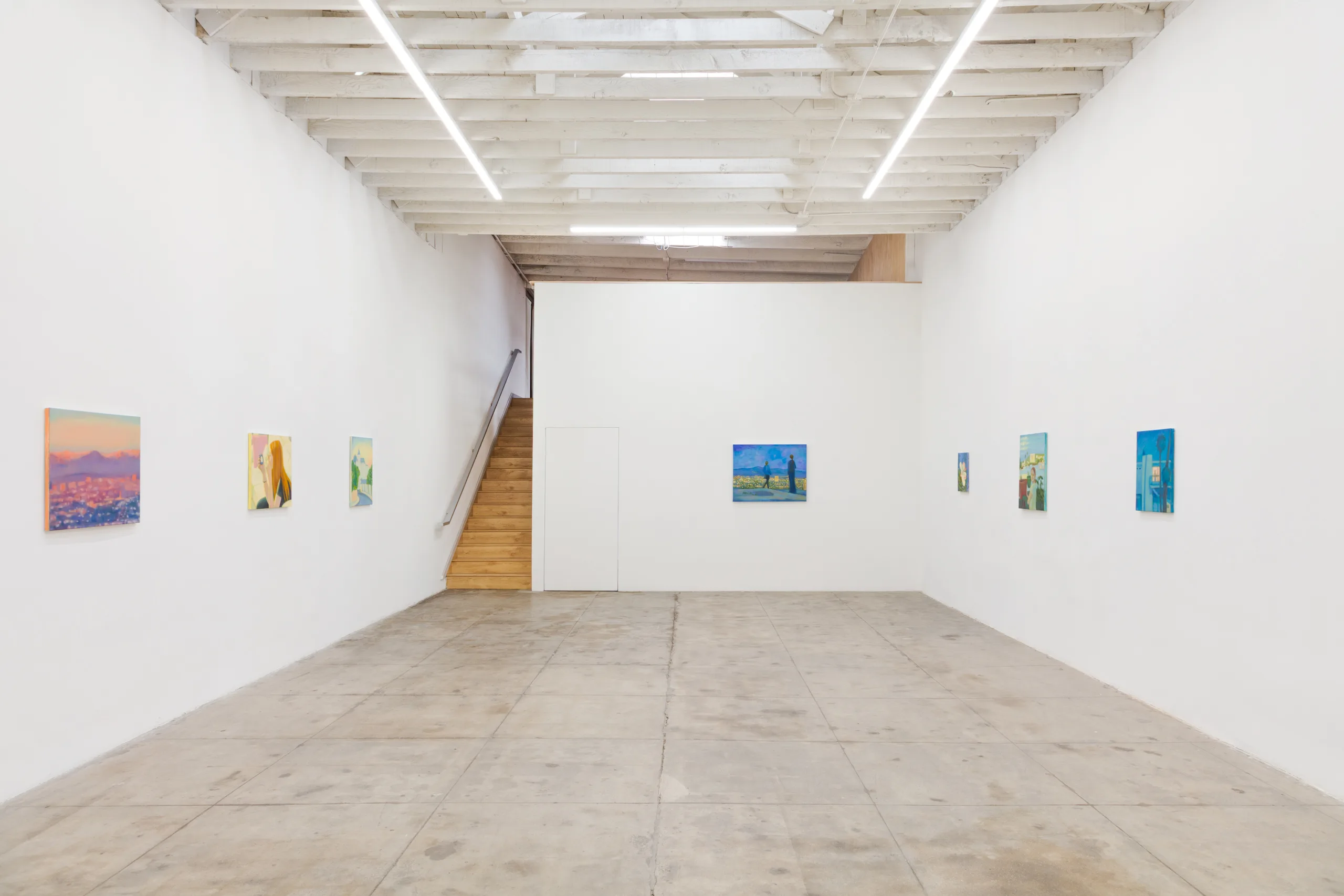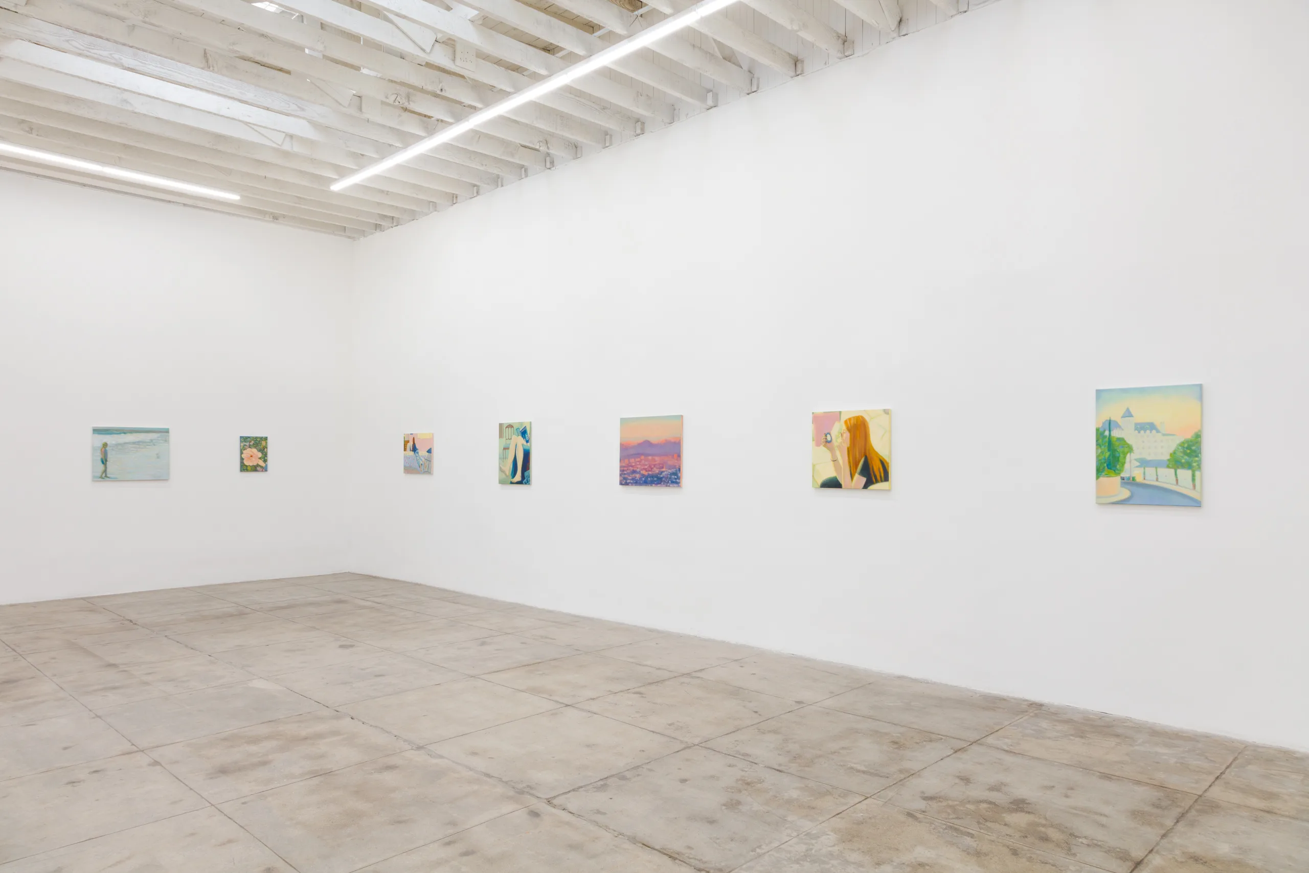 Eventide features paintings of quotidian moments softened by atmosphere. Gradually layering, wiping away, and reapplying oil paint, Paige Turner-Uribe generates an illusion of air, allowing light to move and create depth through the surface of her works. Shifting between scenes within her home, observed moments from her neighborhood, and panoramic views of Los Angeles, Turner-Uribe considers the diffusion and translucence of early evening and morning light as it interacts with color—overlapping and blending forms as they soften at the edges. Though ordinary, the moments captured within her home are as fleeting as the outdoor light—her daughter with her nose buried in a book, applying mascara, or showing off a freshly picked flower in a nearby park.