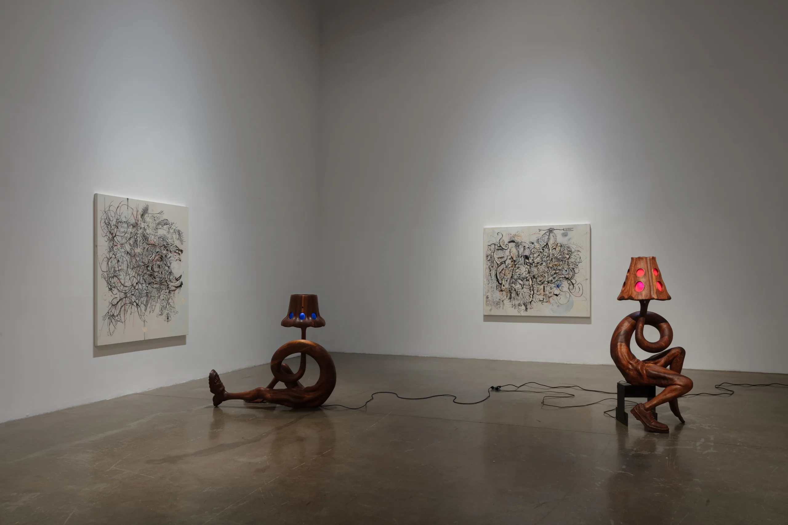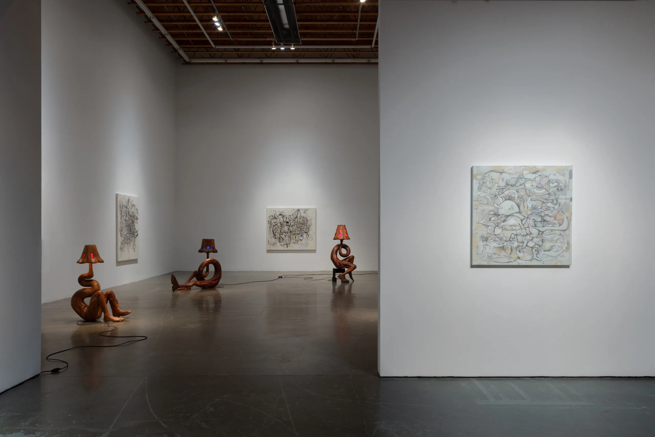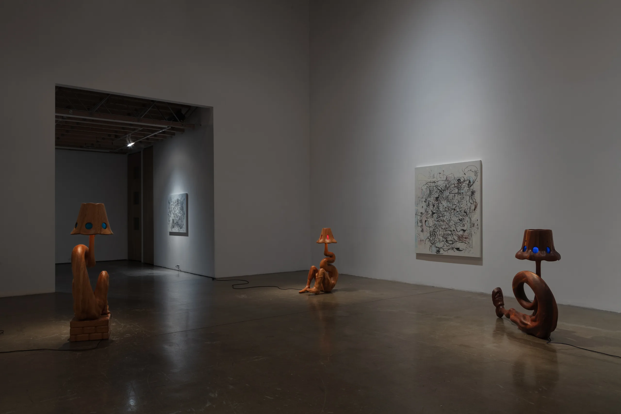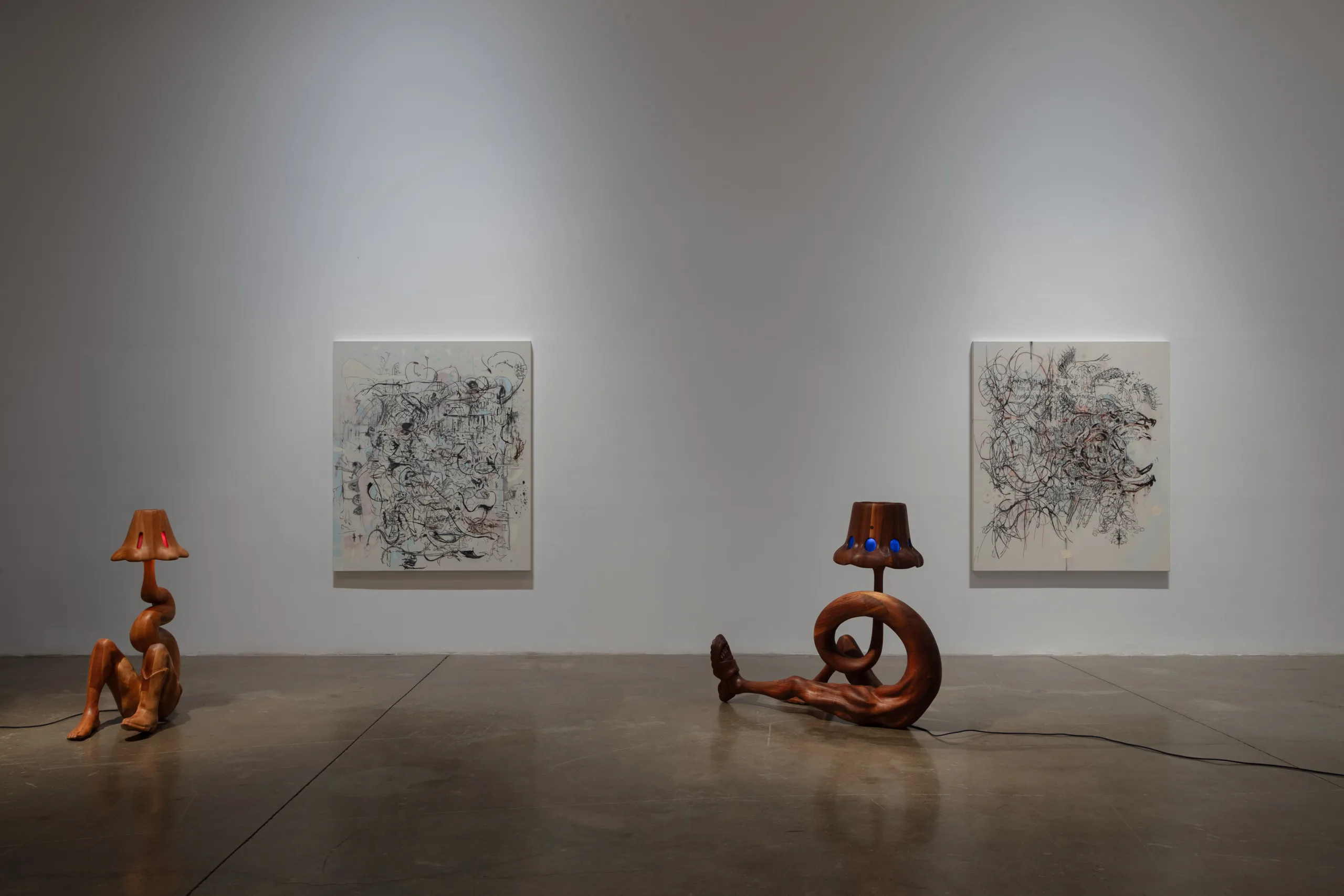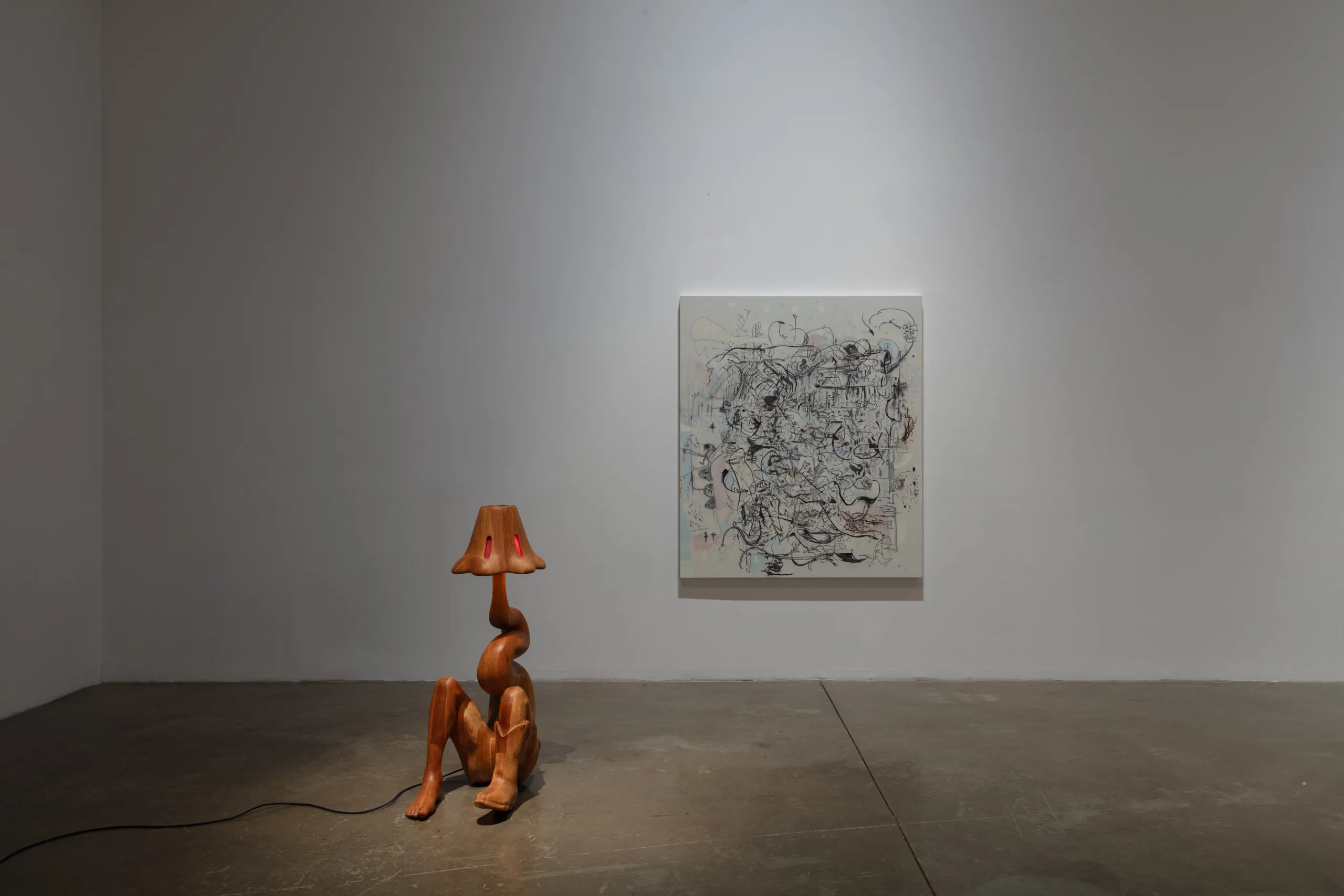 Silent Spines pairs Rives Granade’s abstract paintings and Vincent Pocsik’s anthropomorphic lamp sculptures to complement one another as they push conventional boundaries in their respective mediums – Granade in an exploration of consciousness and Pocsik via his innovative approach to form. Both artists take an imaginative approach to their work to present a corporeal language of unusual curves, shapes, and textures.