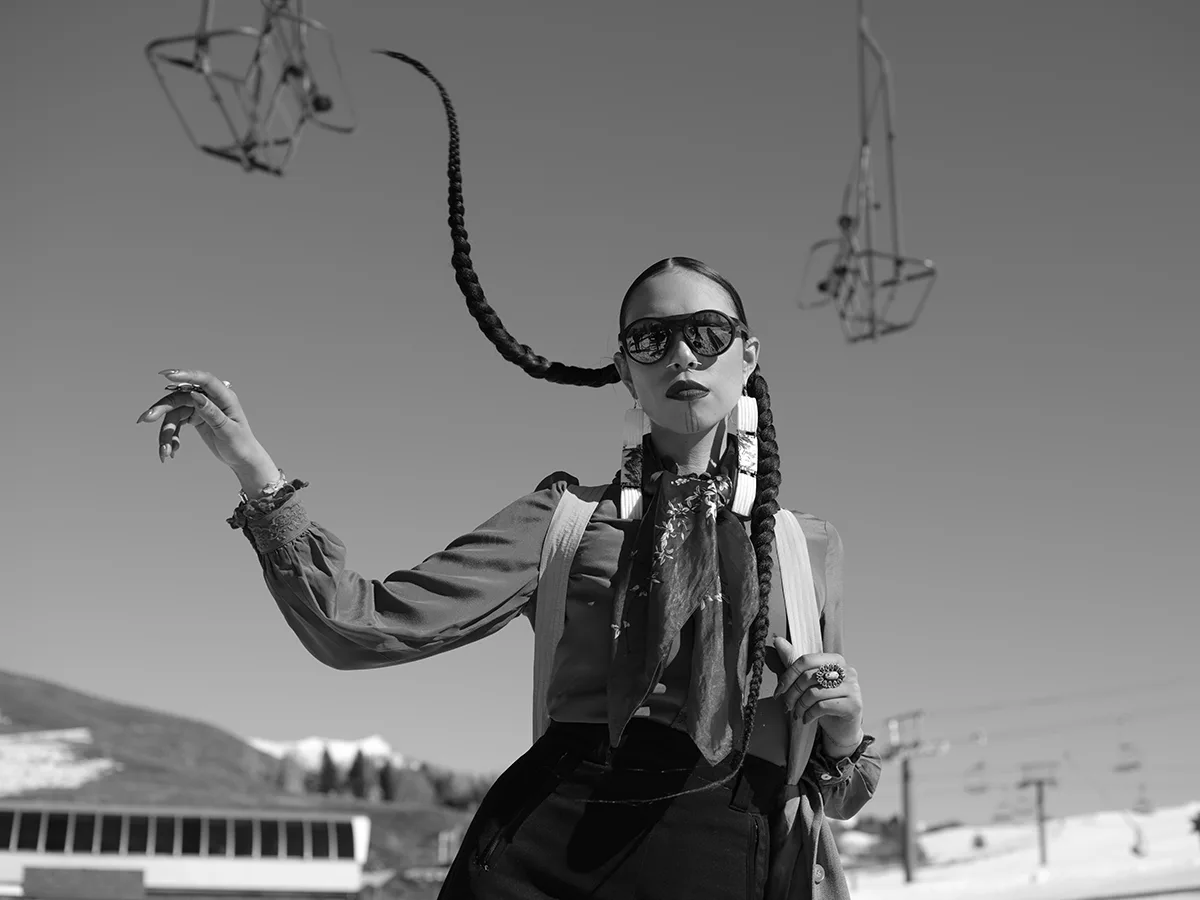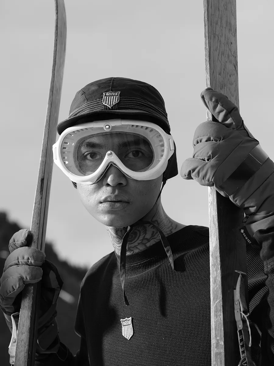 Drawn to the aesthetics of these 1930s–1950s winter sports photographs, Jaramillo pulled together a community of people of color in the outdoor and fashion industries as well as athletes from all over the United States to recreate these historical images of ski culture in Sun Valley. Supermodel and founder of Native Youth Outdoors Quannah Rose Chasinghorse arrived from Alaska; Judith Kasiama, founder of Colour the Trails traveled from Vancouver; and stylist/casting director Terumi Murao flew from New York. The models, producers, and stylists arrived in Sun Valley in the spring of 2023 and again in 2024 to share accommodations, wake up at the crack of dawn, and spend all day outside inspired by the collective goal to create images that celebrate diverse cultures through the lens of these historical ski photographs.