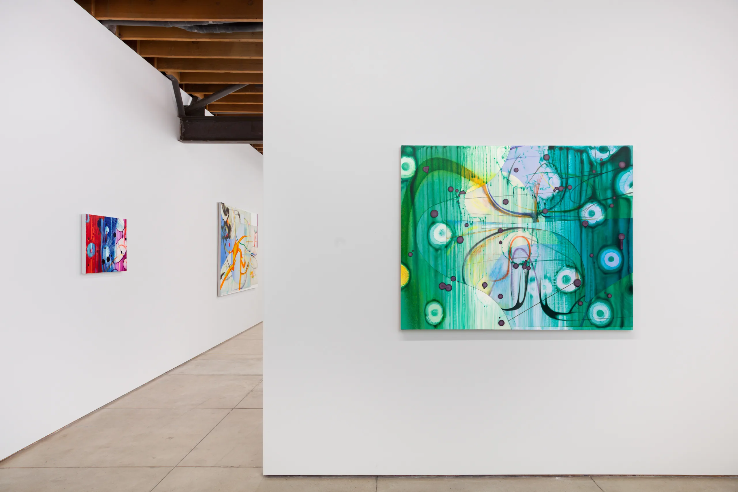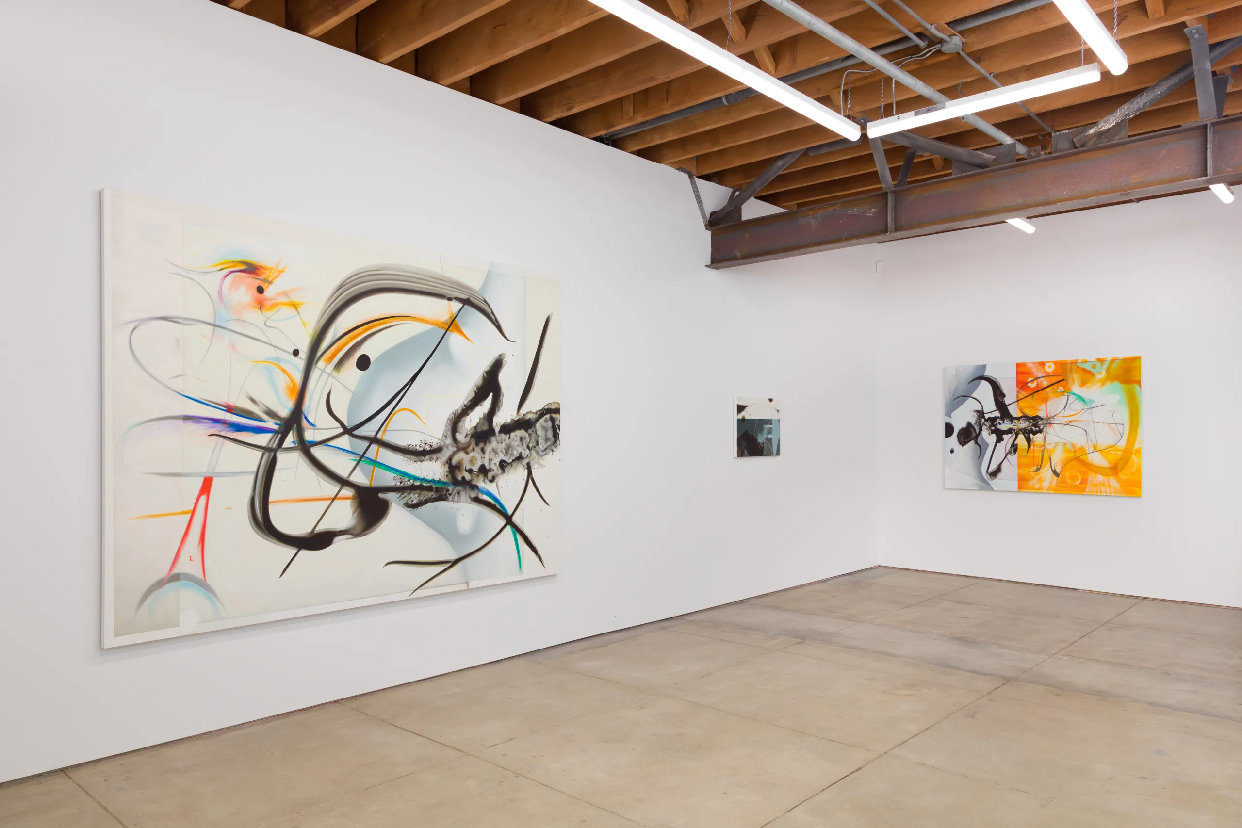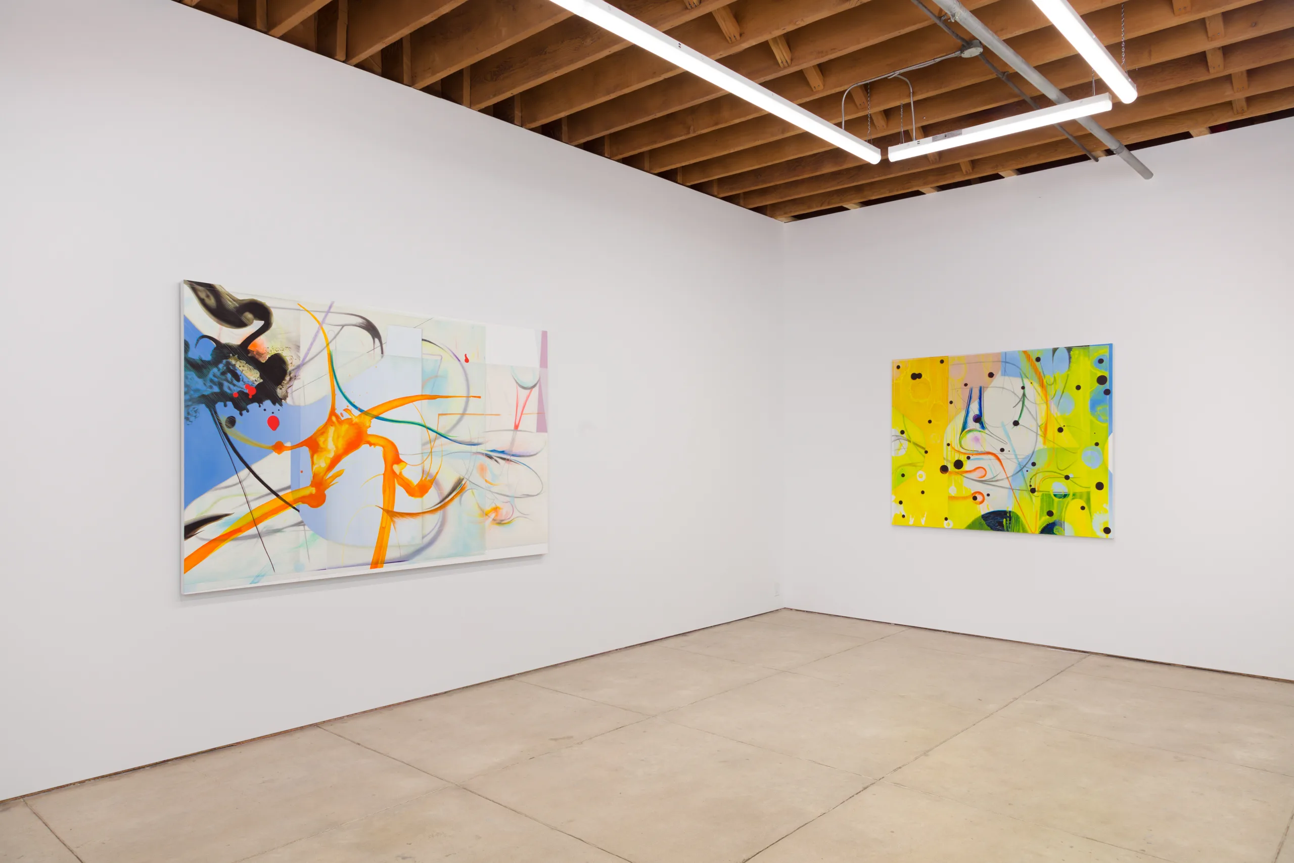 The works on view begin as drawings and material studies on transparent and translucent sheets of mylar. Layering these sheets, the artist composes scenes that harmonize their chaotic and discrete parts. Through photography, the sensuous qualities of the stacks’ dimensionality, shadows and edges, are captured, projected and enlarged onto canvas. Scaled-up lines, marks and forms, rendered in oil with studious precision, reveal new worlds teeming with strange life.