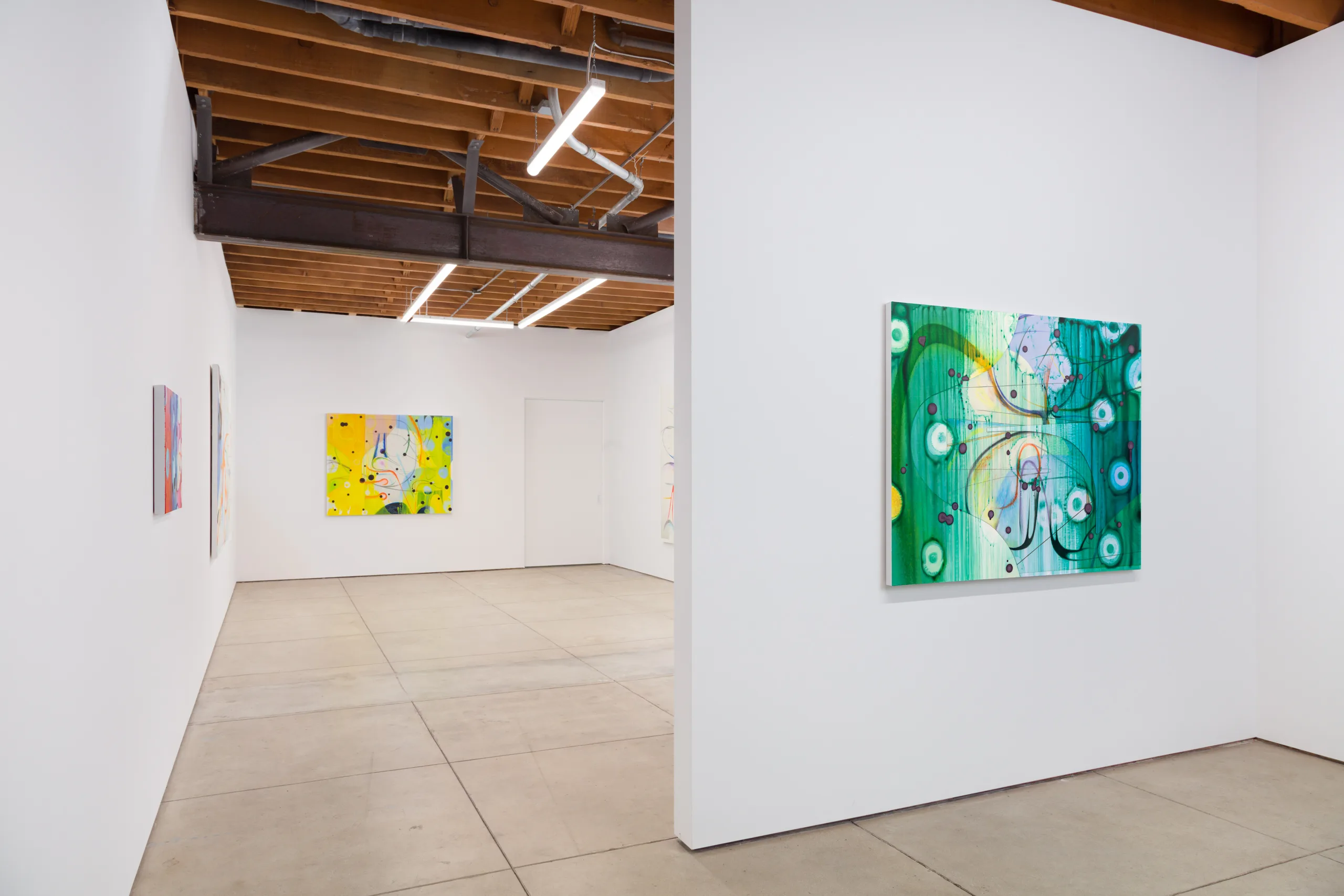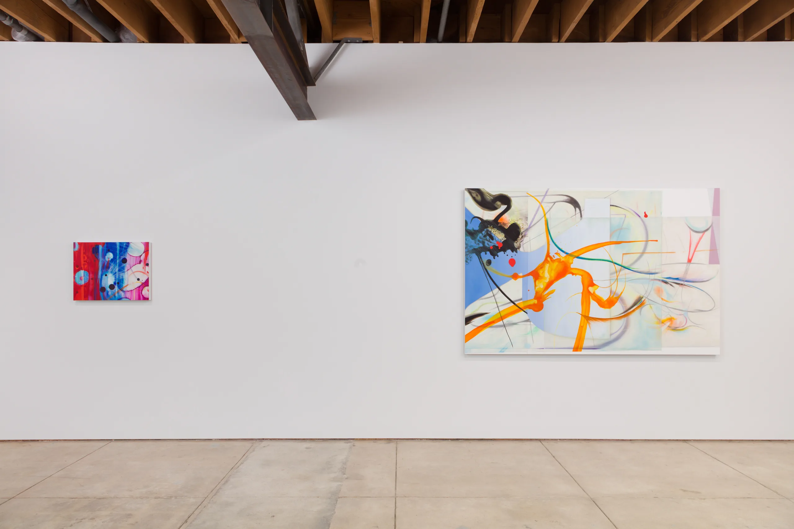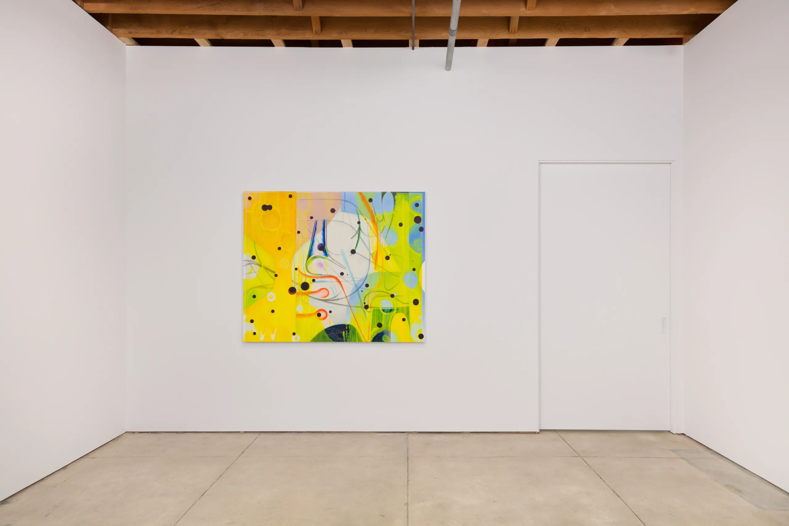 The works on view begin as drawings and material studies on transparent and translucent sheets of mylar. Layering these sheets, the artist composes scenes that harmonize their chaotic and discrete parts. Through photography, the sensuous qualities of the stacks’ dimensionality, shadows and edges, are captured, projected and enlarged onto canvas. Scaled-up lines, marks and forms, rendered in oil with studious precision, reveal new worlds teeming with strange life.