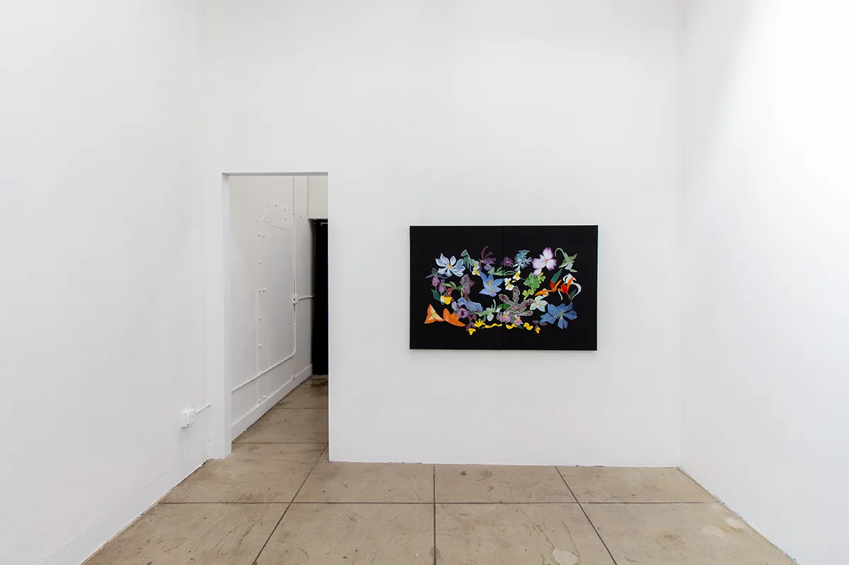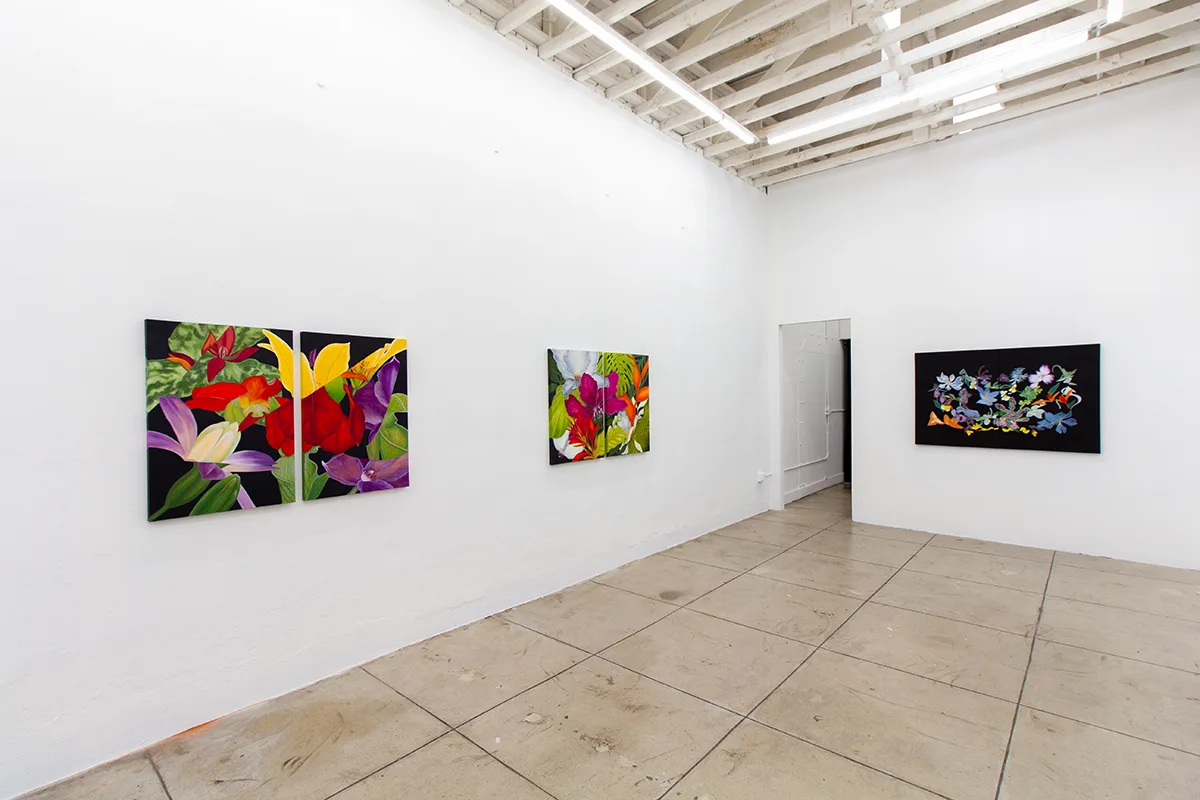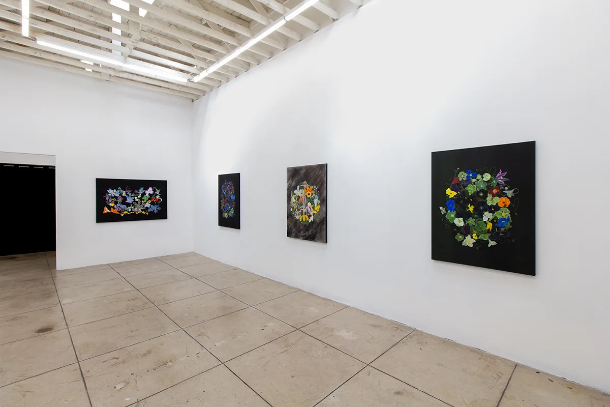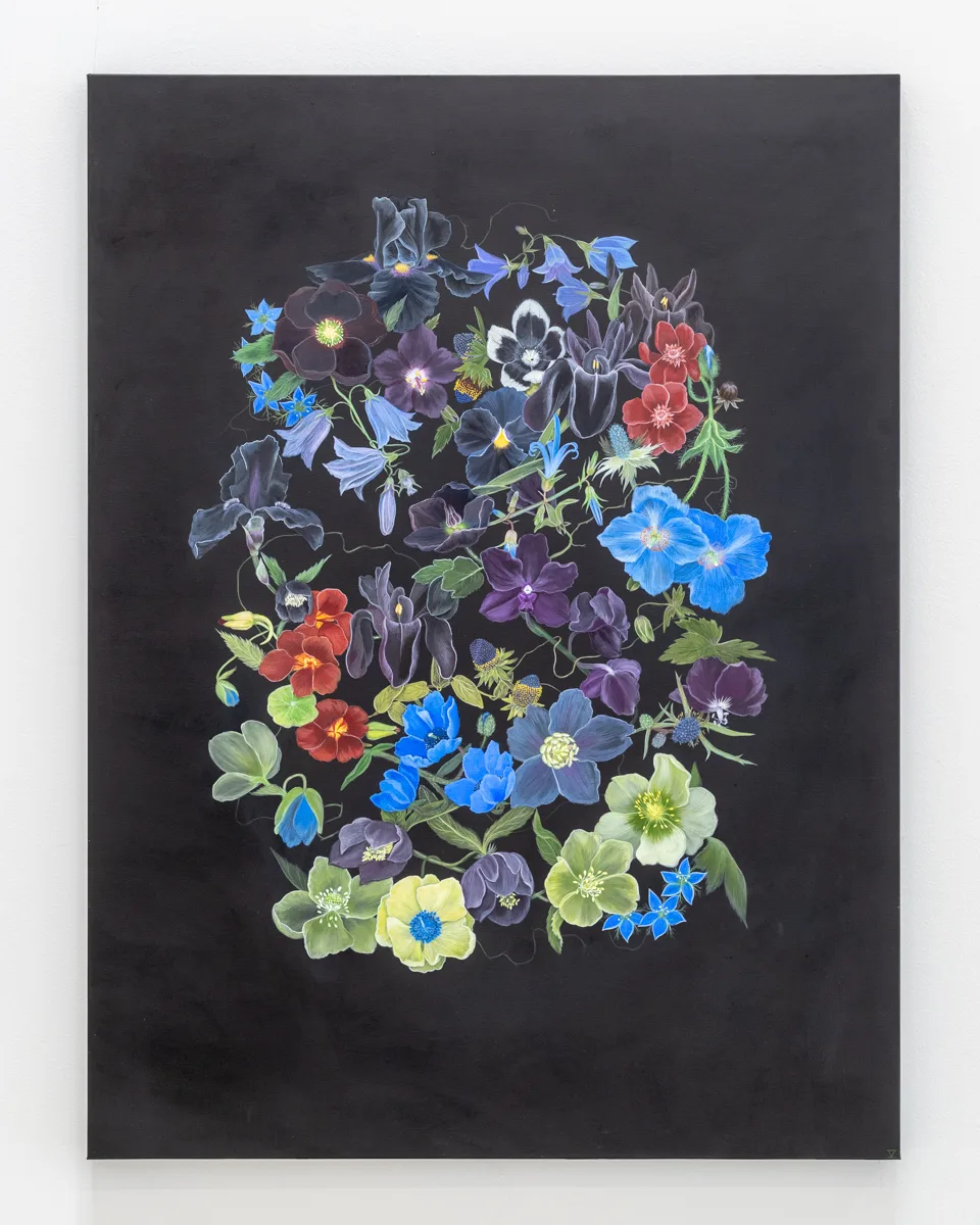 With a steadfast commitment to observing and documenting the natural world, Velia De Iuliis’ rich and highly detailed paintings embrace the dynamic manifestations of myriad living species. Ranging from large scale diptychs to intimate tondos, De Iuliis’ work captures the energy and vibrancy within each interwoven flower. Freely mixing categories of floral subjects—thriving and endangered, uncommon and familiar, tropical and temperate—De Iuliis’ paintings celebrate the sublime existence and fleeting temporality of each plant. Building still life montages on abstract backdrops, De Iuliis delicately entwines and poses each petal, leaf, and stem, as she meditates on the complex relationships between humans and their ecosystems.