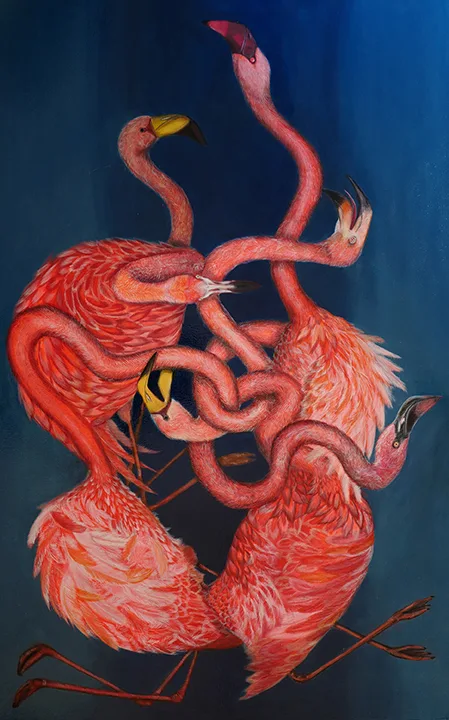 Despite their impressive level of detail, de Iuliis’ images are not direct representations of creatures in their natural environments; rather, her images always contain some kind of invented narrative. De Iuliis’ paintings celebrate the beauty of what she depicts, but they’re not political and she doesn’t over-anthropomorphize her subjects. Instead, each painting seems to be a personal homage to whatever she’s portraying. Fowl Entanglement shows a series of flamingos with their necks all in knots—the rendering of the birds themselves is accurate in its detail and de Iuliis has worked the surface of the painting to perfection. And yet the birds are in an entirely impossible situation, ridiculous—hilarious even. It’s as if de Iuliis has chosen to paint this fanciful scene in order to, ironically, better understand reality and the disorder of the world. She writes about her work, “history shows us that humanity can be destructive, at times unpredictable, disloyal, selfish and cruel. I continue to find peace and hope within the natural world where instinct is unwavering and questions are answered.”