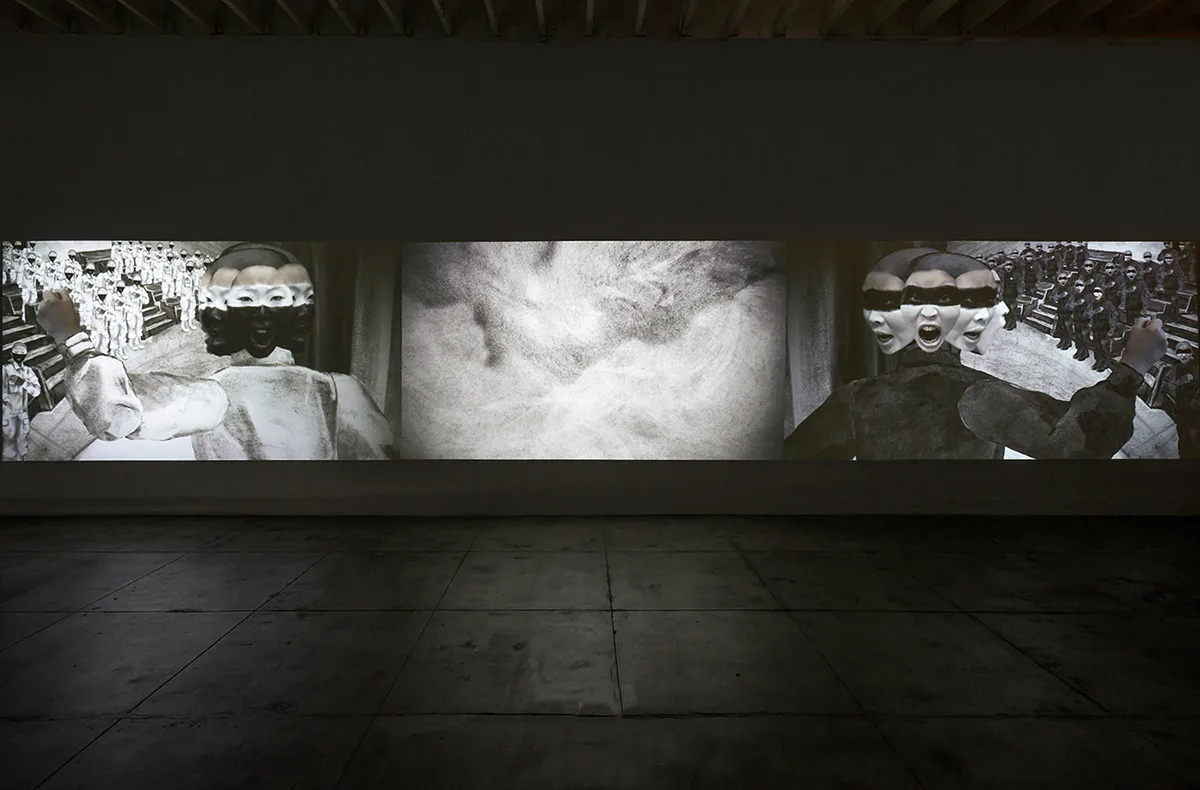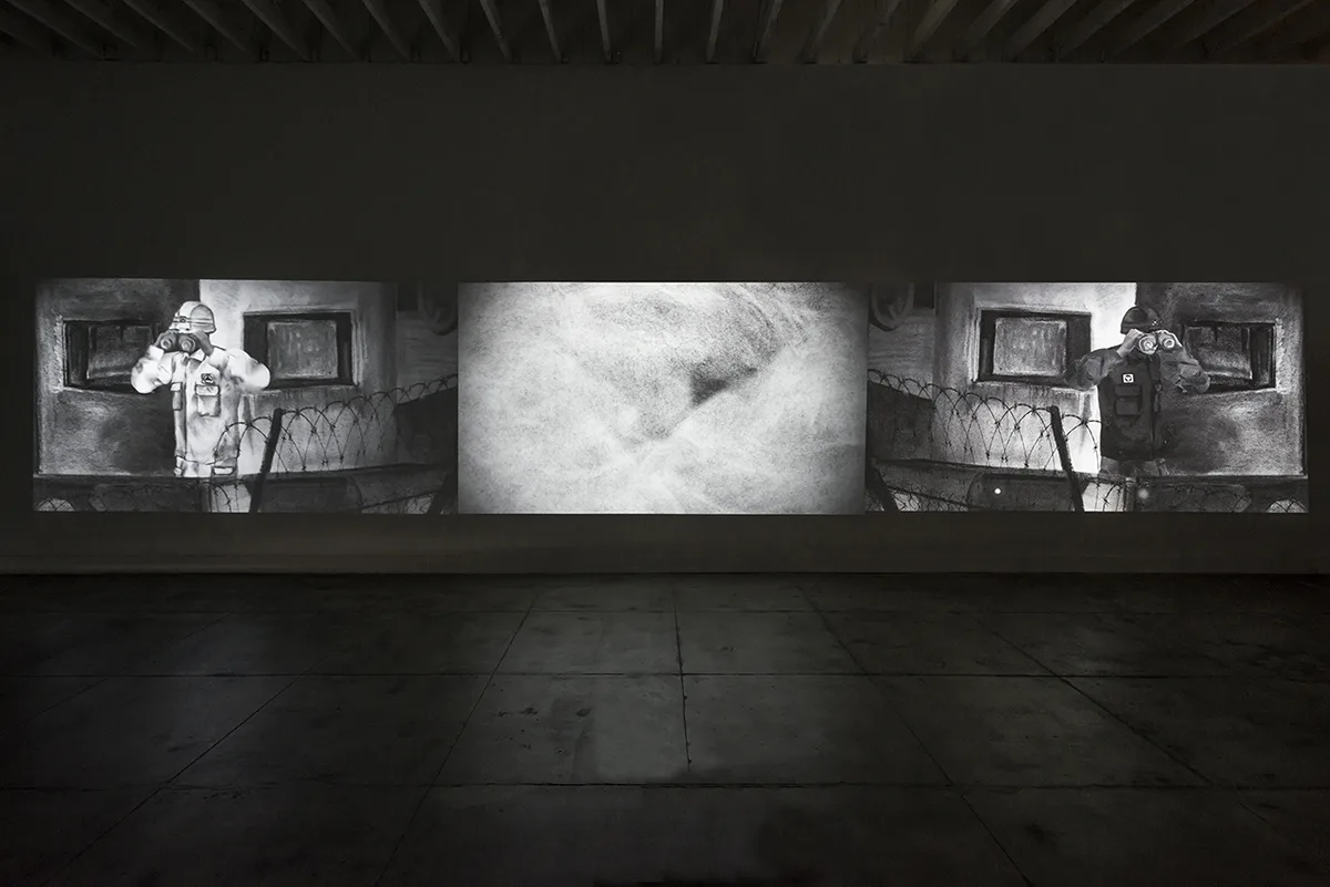 Young Joo Lee combines inspiration from her dreams with personal and political histories to create drawings, sculptures and films. On view in the downstairs gallery, Paradise Limited is a three-channel animation based on Lee’s year-long project about the nature sanctuary at the Korean Demilitarized Zone (DMZ). Lee documented her research as a 25-meter scroll drawing, a reference to traditional Korean landscape painting, and created a sculptural scroll display to house the work, which provided the background for the film. Combining her research, dreams and interviews, Paradise Limited explores history, war, and the function of drawing as a medium that creates memory of and in the body.