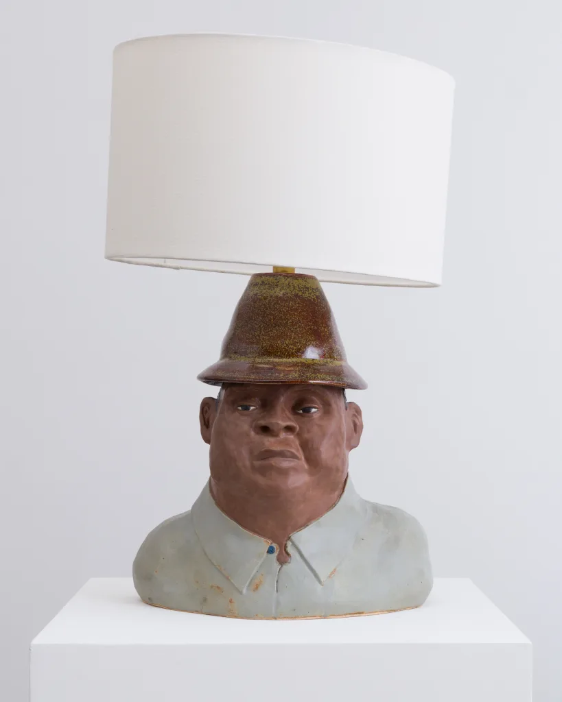 Hana Ward’s sculpture Old Timer (vigna unguiculata) (2024) is seen in dialogue with New Era (vigna unguiculata) (2024)—both of which are functional ceramic lamps named for two varieties of cowpea listed in George Washington Carver's Bulletin No. 35, "How to Grow the Cow Pea and 40 Ways of Preparing It as A Table Delicacy." Commonly known as the black-eyed pea, cowpeas increased the yield of the land in which they are grown because microbes in their root nodules release nitrogen, increasing soil fertility. Because of this, cowpeas have become a symbol of abundance, good luck, and prosperity and were historically referred to as "the mortgage lifter" and "the poor man’s bank.”