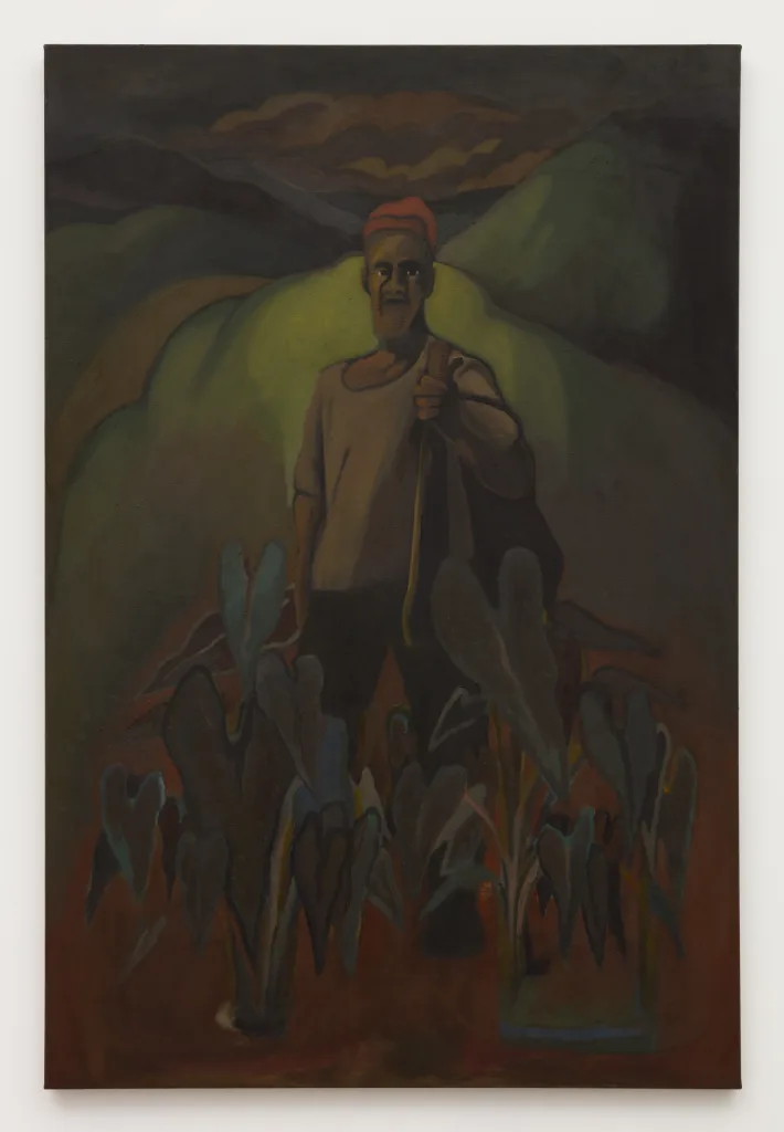 “My uncle Deron has been the keeper of peace, the provider of the people, and loved by the community. He works the land and is religious in his own rite. I pictured him as this monumental figure descending the mountain, metaphorically as Moses back to the people. Cocoyam or Taro is a type of root staple showing up in soups and other comfort dishes. The various shapes of the leaves dancing in the breeze and clustered together in support much like community.”