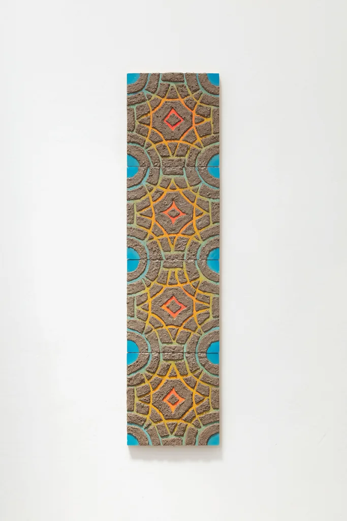Water-based enamel, gravel, Flashe, and acrylic on panel