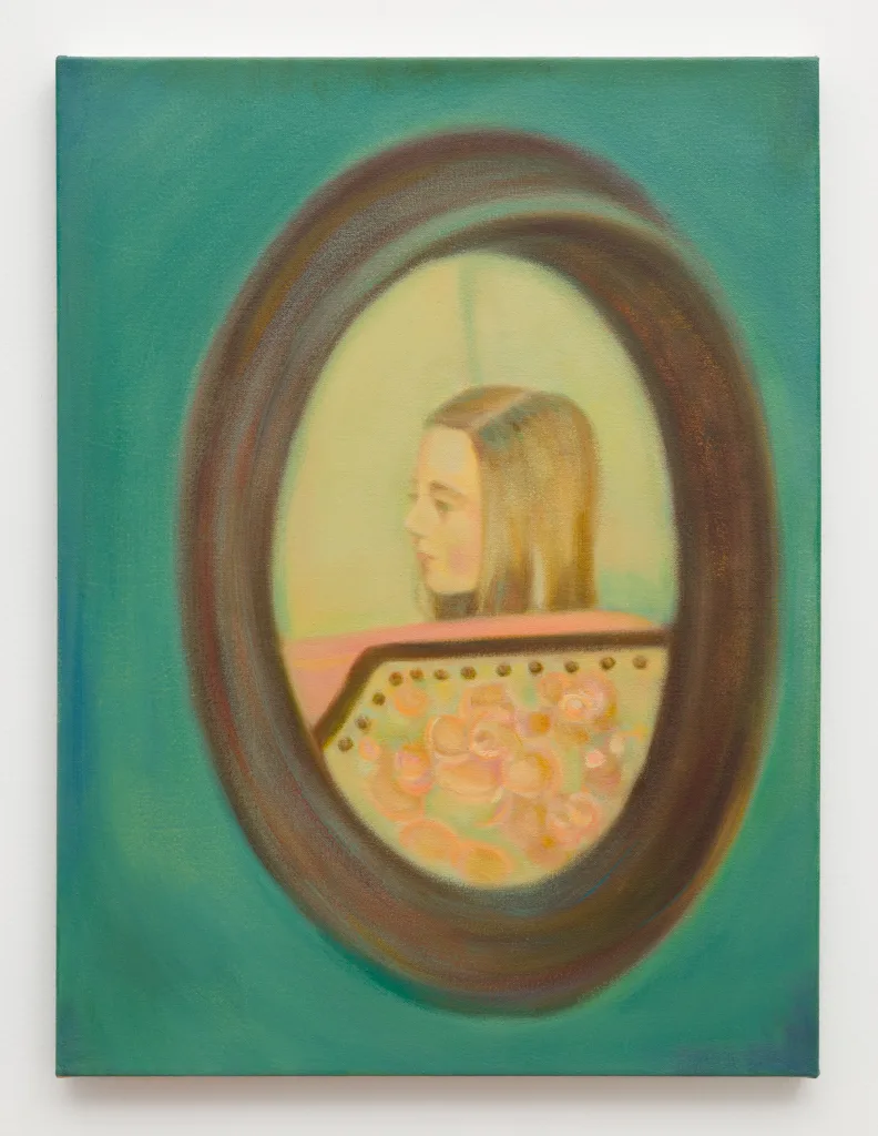 Seated on a loveseat passed down from her great grandmother, Paige Turner-Uribe’s Reflection in an Oval Mirror (2023) depicts a reflected side profile of her youngest daughter. Turner-Uribe keeps a few mirrors hung up in the living room to keep it brighter, always considering the way light moves in a space. In this moment, her daughter watches television in the early evening. White walls appear viridian in the low light while the girl’s reflection glows as a cameo in the mirror.