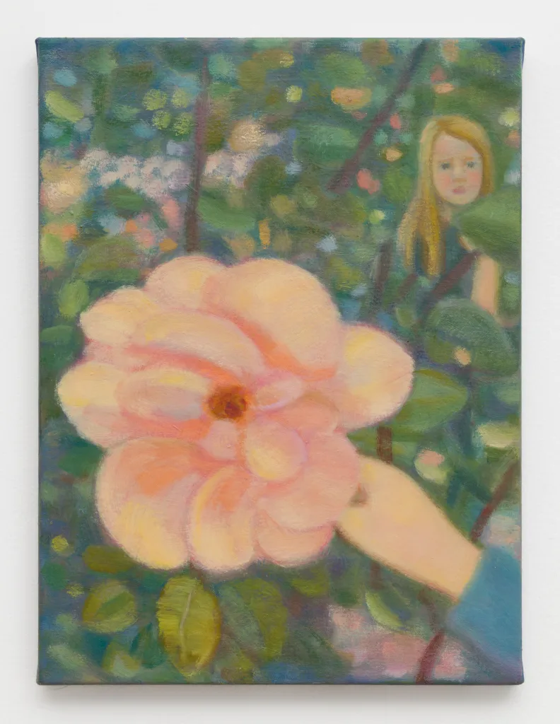 City plazas, office parks, and churchyards are the backyards of apartment dwellers raising children in urban apartments. The artist explains, “A park isn’t always nearby, so every garden or churchyard becomes a play opportunity.” In Saint Rita’s Garden (2023), Turner-Uribe’s eldest daughter holds a flower up to the viewer while the younger sister looks on from the background of an early evening visit to this garden. The oversized rose pushes up against the foreground of the canvas, its peachy yellow paint composed of translucent layers of texture plays with perspective and scale.
