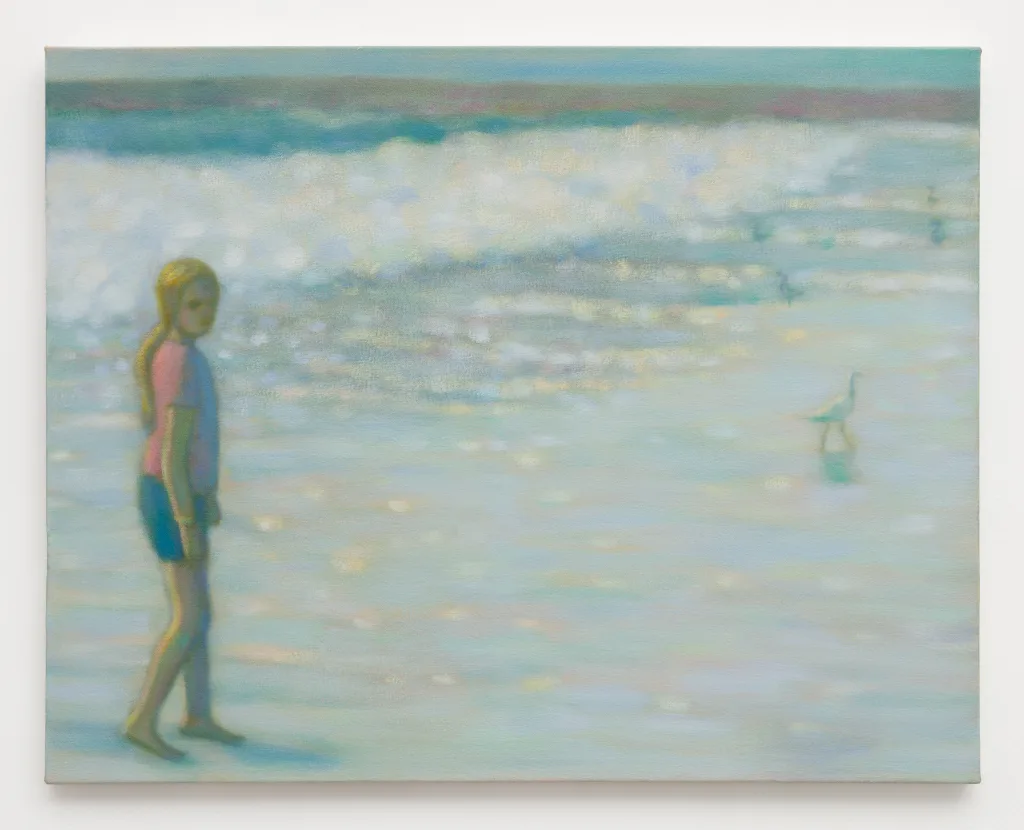 Paige Turner-Uribe’s Pearlescent Tide (2024) features late afternoon Los Angeles light reflecting on the ocean water. Soft blues and shallow water meet the egrets fishing in the tide and her youngest daughter out on a walk, offering a serene moment at the ocean on the fringe of the bustling city.