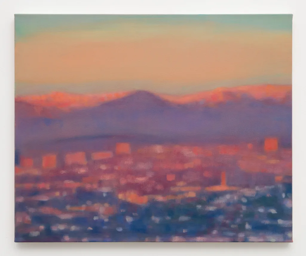 Paige Turner-Uribe’s San Gabriel a la Mode (2024) features a landscape view from Griffith Park on the east side of Los Angeles. The San Gabriel Mountains have a dusting of snow on top of them which is highlighted by the reflection of the sunset. The haze and pollution present a contradiction familiar to anyone in Los Angeles. Though they indicate a deteriorated air quality, they provide a beautiful sunset that reflects off the many glass buildings.