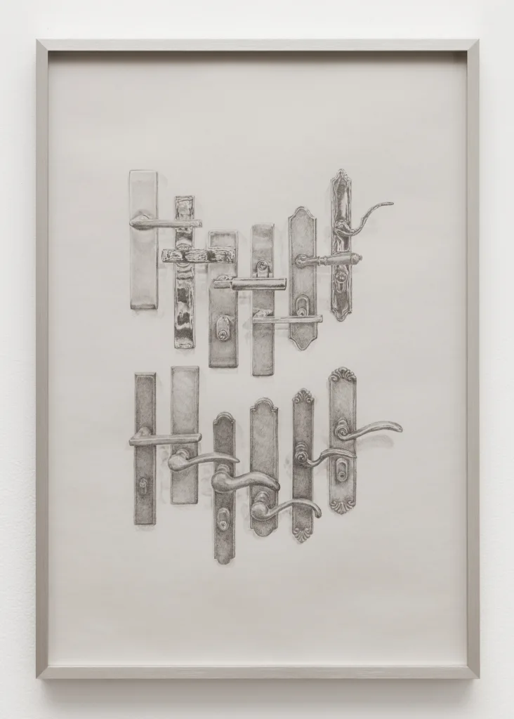 Tanya Brodsky investigates the poetics of malfunction and the material residues of built environments. Her practice mines the tension between archeological artifact and commercial display, evoking a haunting intimacy with spaces we pass through daily but rarely consider. Pacific Design 1 (2024) is part of a series of drawings of doorknob displays at high-end architectural hardware stores, based on snapshots taken by the artist on site. Brodksy explains, “Both the display and the photographs of it deal with some disembodied version of a similar utilitarian object: one before it enters its regular function, and one after. To me, the drawing/ photo and casting play similar roles in terms of generating an isolated imprint of an object.”