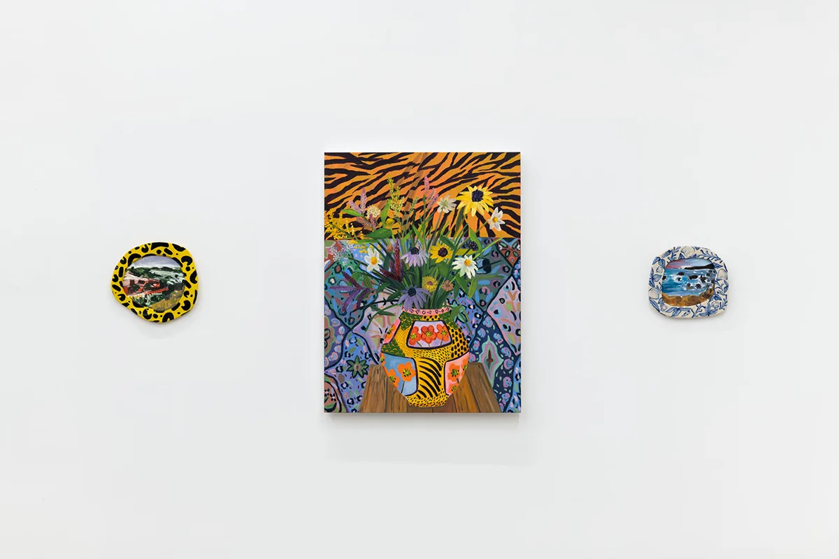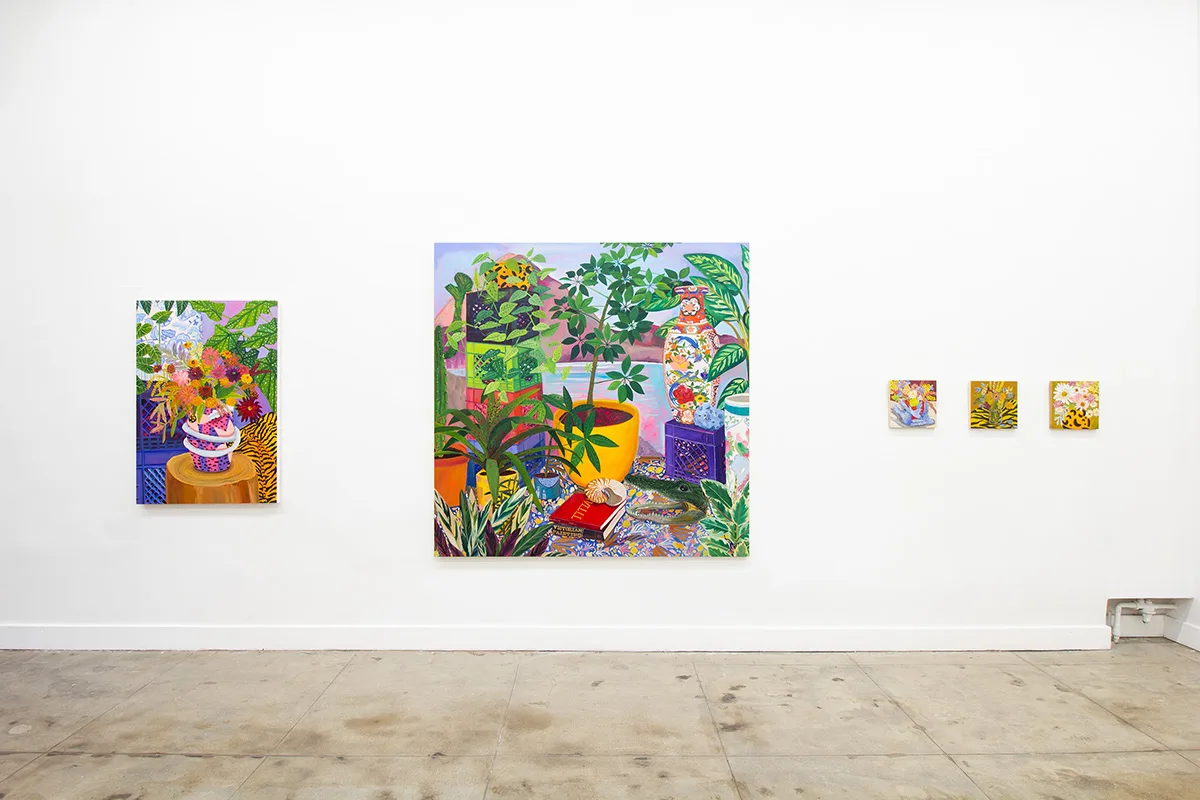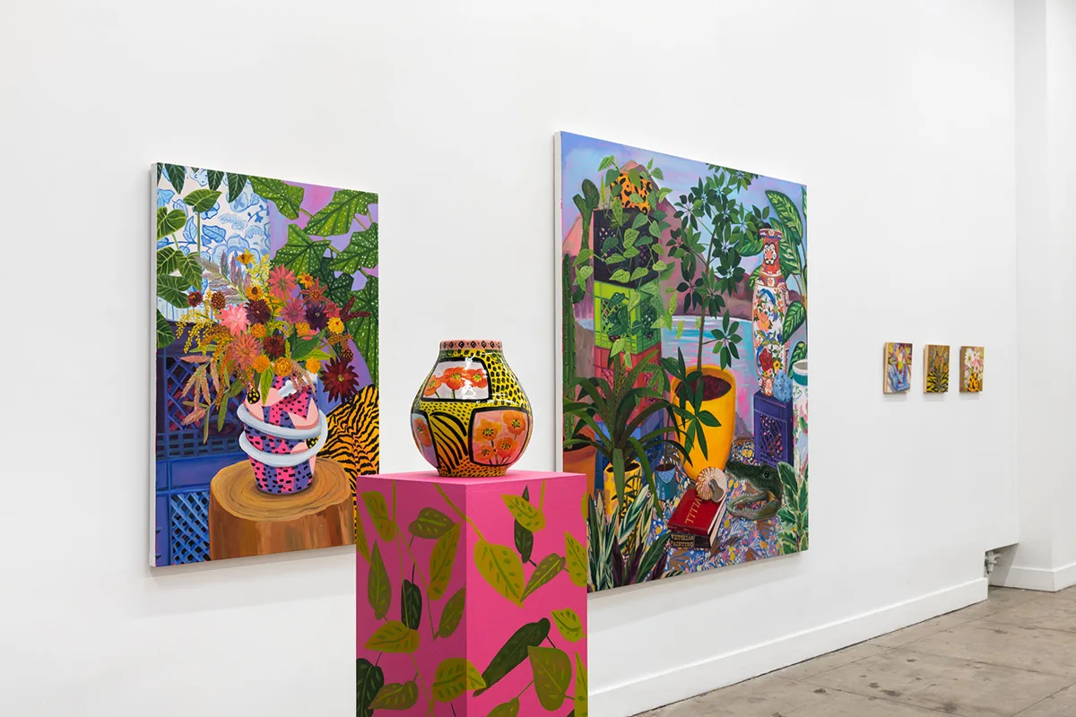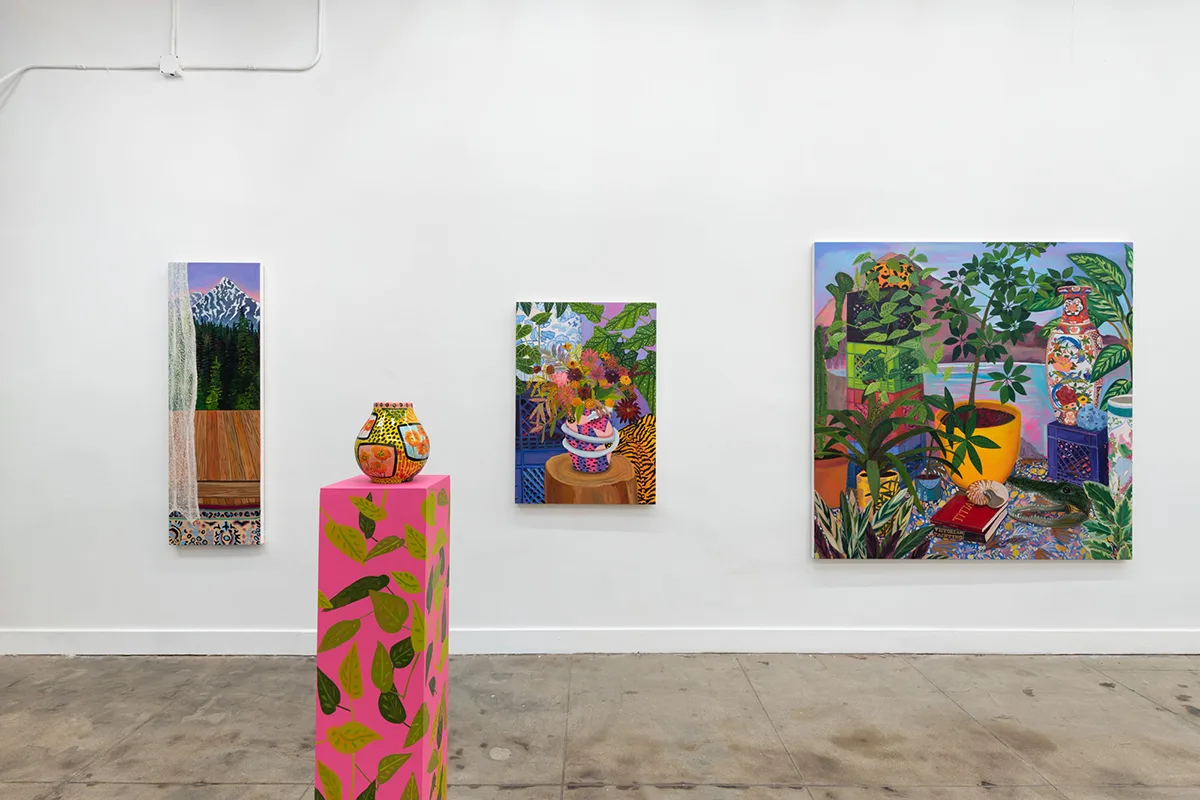 A real or imagined place, rustic or idyllic in nature, an arcadia provides peaceful, simple pleasures. After Valdez assembles groupings of objects, plants, books, ephemera, and artworks in her studio, she cultivates digital drawings, ceramics, prints, sculptures, and many, many paintings from each set up. Though some objects are personally significant, nothing is sacred in depiction—Valdez “paints from life, but doesn’t adhere to it.” An ex-anthropologist and self-proclaimed unreliable narrator, Valdez creates multiple realities, perspectives, and portals. In Shell Study with Decorative Landscape (2021) a ceramic landscape of the sea sculpted by the artist hovers above a book about seashells, pinned open by a conch converted into a lamp, framed by potted plants and a bouquet of flora patterned fabrics. Valdez paints the pungent layers of reality with ease—an object, its representation, its abstraction, and its bibliography all peacefully coexisting. With even lighting and stiff drop shadows, Valdez eschews the passage of time and paints in a hyper vibrant spectrum of fuchsia, electric blue, tiger orange, violet, and hot pink—a reflection of the present, her presence, and her story told her way.