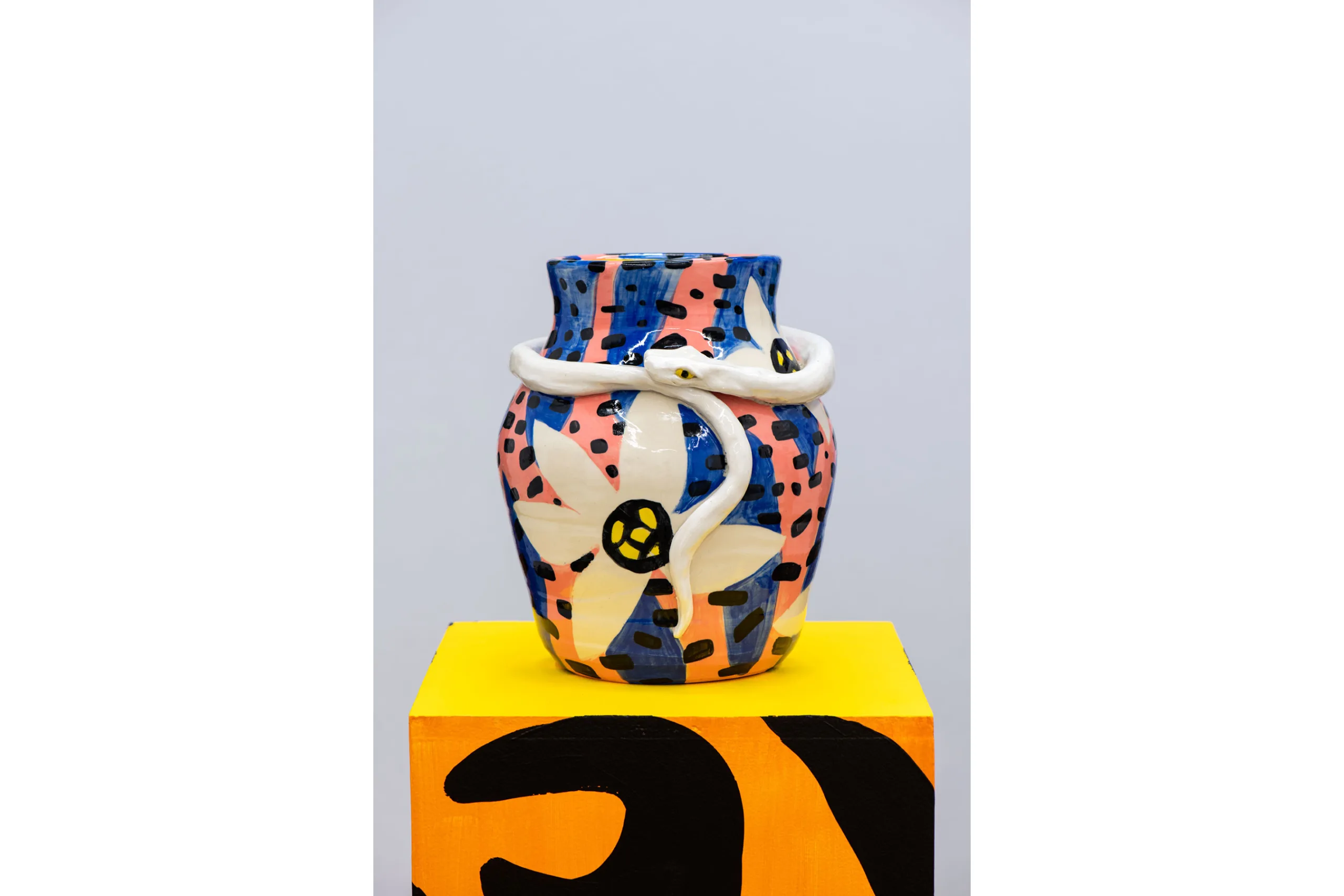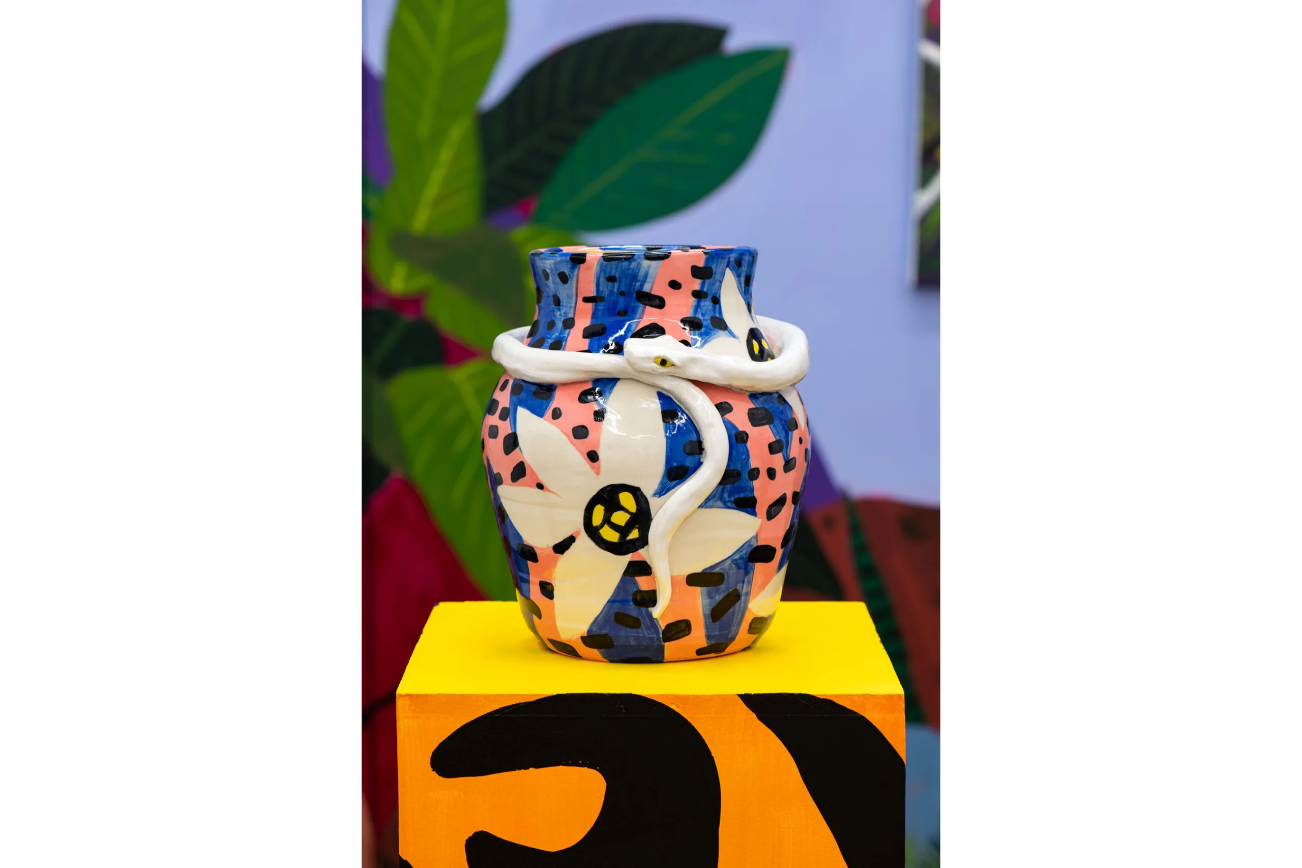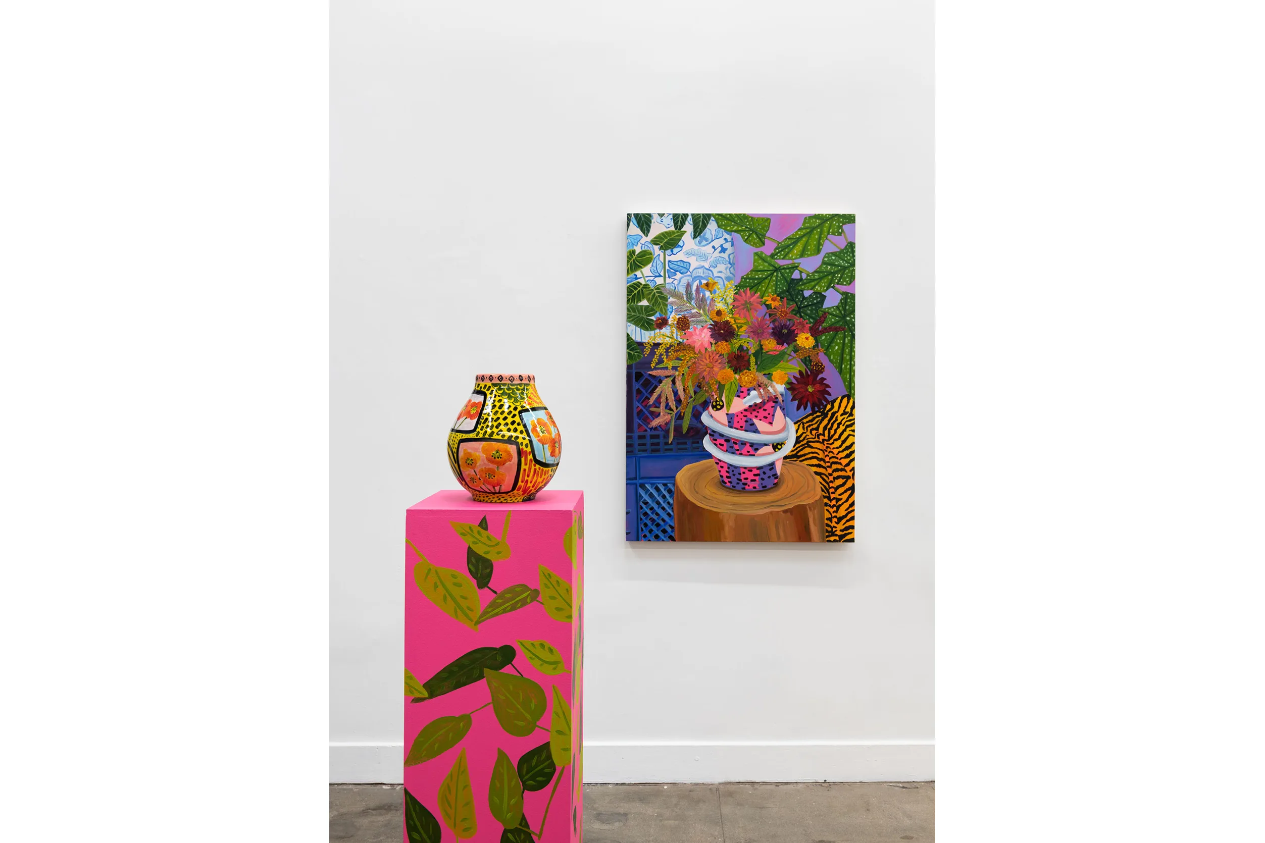 A real or imagined place, rustic or idyllic in nature, an arcadia provides peaceful, simple pleasures. After Valdez assembles groupings of objects, plants, books, ephemera, and artworks in her studio, she cultivates digital drawings, ceramics, prints, sculptures, and many, many paintings from each set up. Though some objects are personally significant, nothing is sacred in depiction—Valdez “paints from life, but doesn’t adhere to it.” An ex-anthropologist and self-proclaimed unreliable narrator, Valdez creates multiple realities, perspectives, and portals. In Shell Study with Decorative Landscape (2021) a ceramic landscape of the sea sculpted by the artist hovers above a book about seashells, pinned open by a conch converted into a lamp, framed by potted plants and a bouquet of flora patterned fabrics. Valdez paints the pungent layers of reality with ease—an object, its representation, its abstraction, and its bibliography all peacefully coexisting. With even lighting and stiff drop shadows, Valdez eschews the passage of time and paints in a hyper vibrant spectrum of fuchsia, electric blue, tiger orange, violet, and hot pink—a reflection of the present, her presence, and her story told her way.