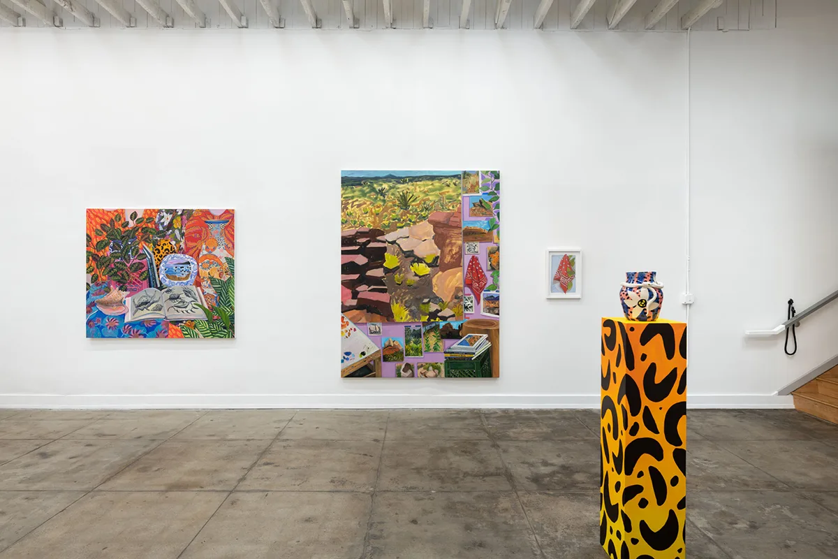 In Landscape Paintings (2021) a single desert landscape painting dominates the composition, its raw edge of canvas casting shade on a pink wall that displays more than a dozen small landscapes akin to marginalia in an illuminated manuscript. It is unclear whether these are postcards, sketches, photographs, magazine clippings, or small paintings, though the pile of artist monographs ostensibly full of even more unviewable landscapes perpetuates the tease. Since an image of a place is an object, Valdez’s still life of landscapes deftly navigates new terrain, anchored by her palette table tucked into the corner, overlapping the largest landscape like a cactus bloom.